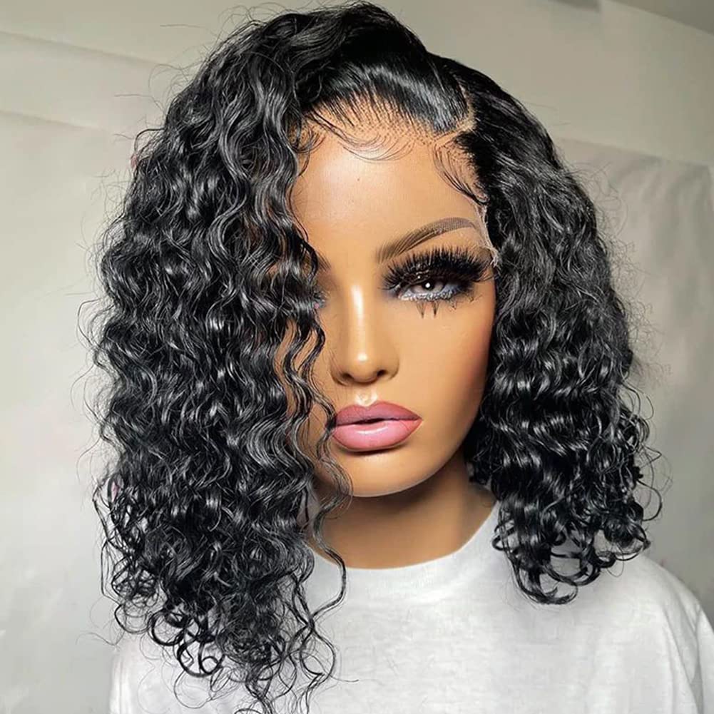 13 X 4 Short Bob Wigs Water Wave Lace Frontal Real Hair Wigs Brazilian Pure Human Hair Wigs For Black Women Glueless Pre-plucked With Baby Hair Natural Black 150% Hair Density 10 Inches