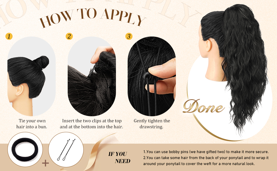 • 【Easy to Wear】You need to tie your own hair into a bun, then place the drawstring ponytail on top of the bun, insert the two clips into your hair, and tighten the drawstring to tie it to your hair. Drawstring ponytails will give you your favorite ponytail hairstyle in no time.