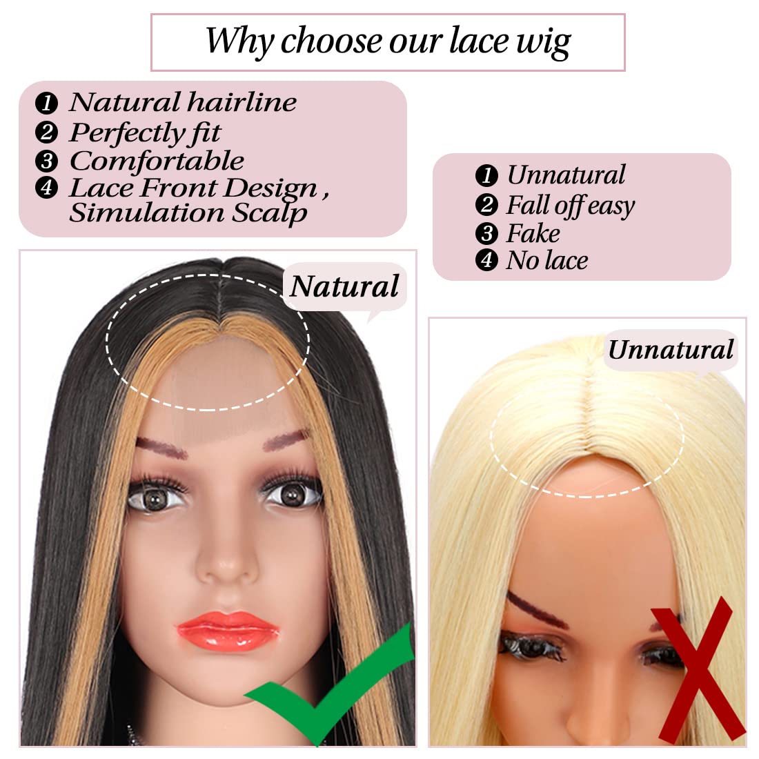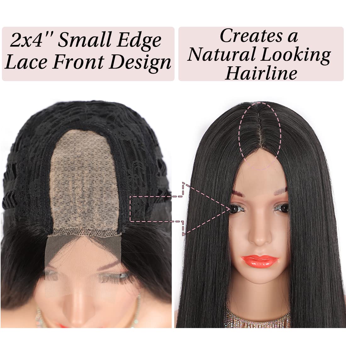 Natural hairline: compared to other synthetic wigs, our edge lace middle parting wigs have the unique design, which has a small edge lace front design, making them look more natural and realistic.