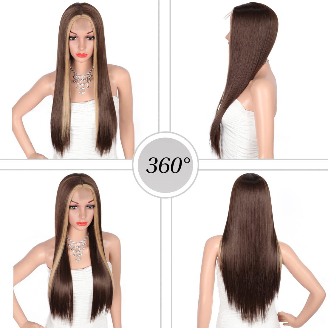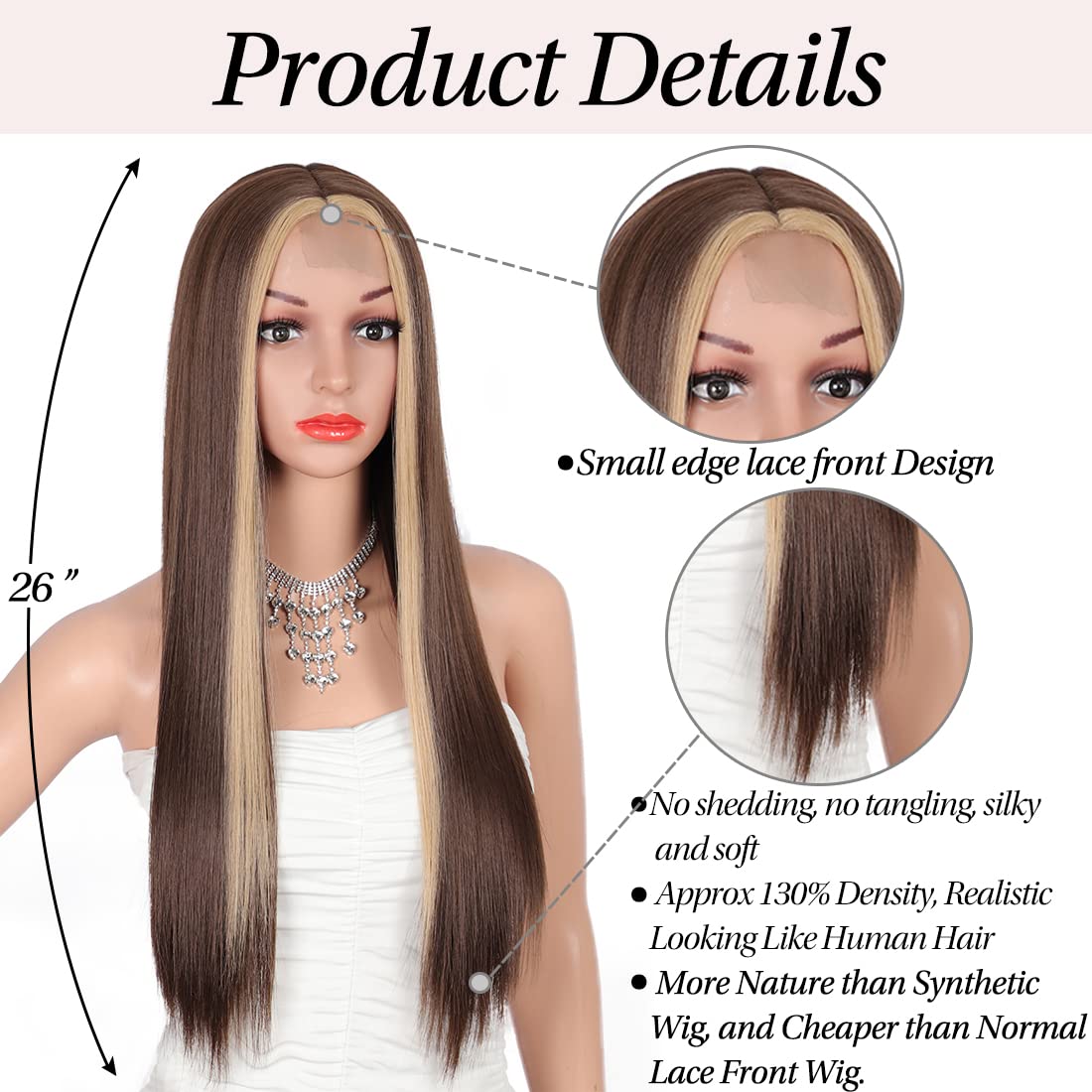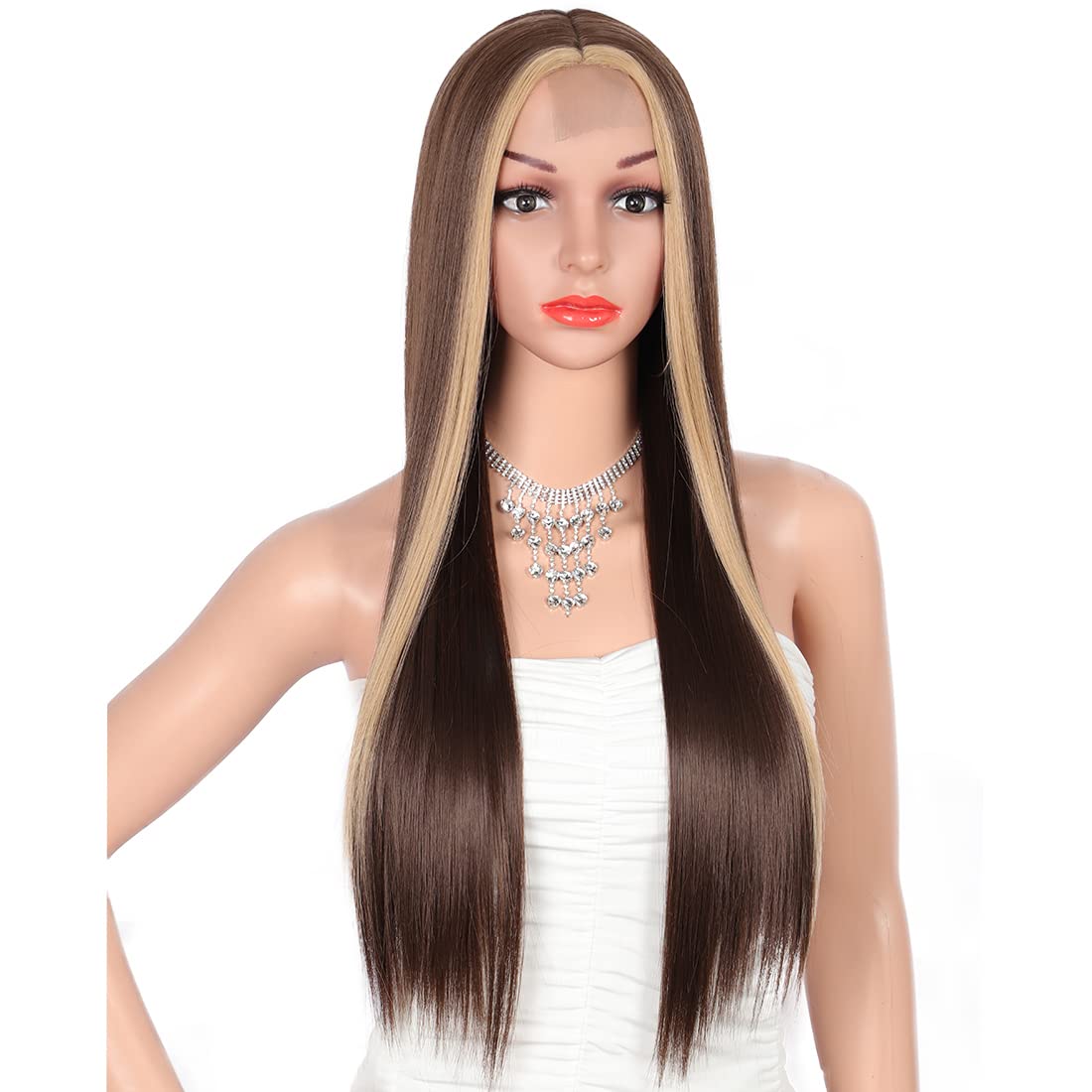 26 Inches Long Straight Plastic Edge Brown With Light Brown Stripes Medium Part Wig With Dark Roots Natural Looking Frontal Lace Wigs ..
