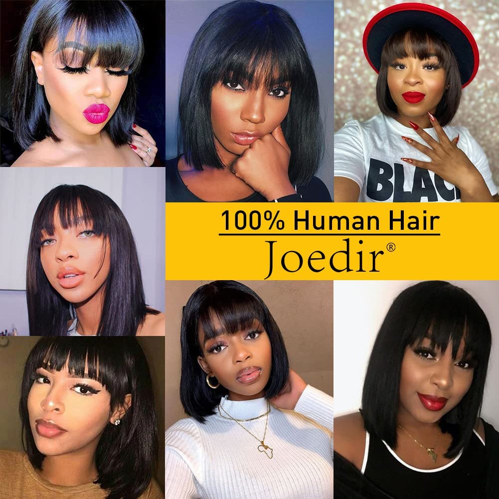 - WIGS WITH BANGS: 8 inch straight bob wig , 100% unprocessed human hair wigs with bangs, Machine Made, None-Lace.No shedding and Tangle.Thick and very soft texture, can be restyled, curled. Gives you natural looking and comfort.
