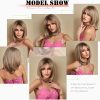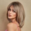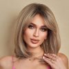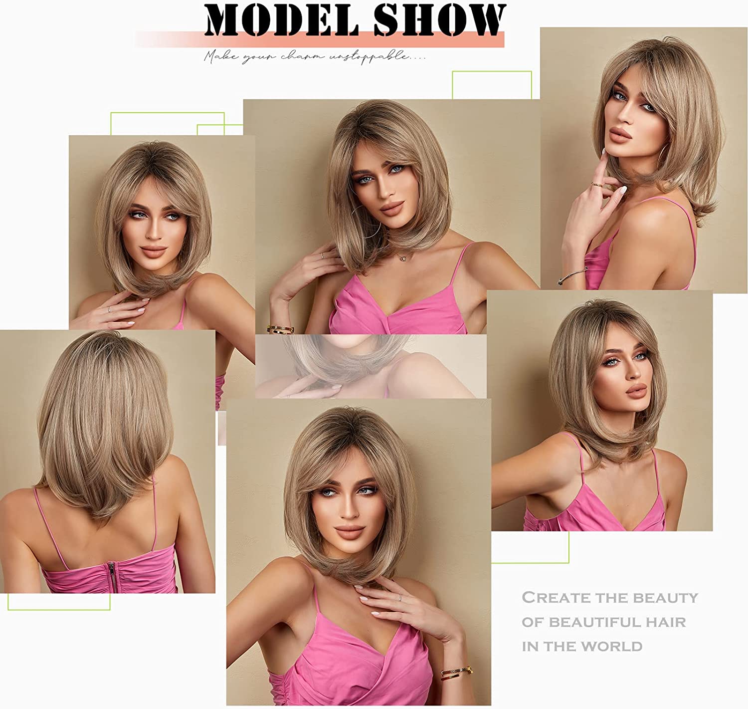 Ash Blonde Wigs For Women Bob Shoulder Length Layered Synthetic Dark Roots Hair Wig With Fringe Side Parting