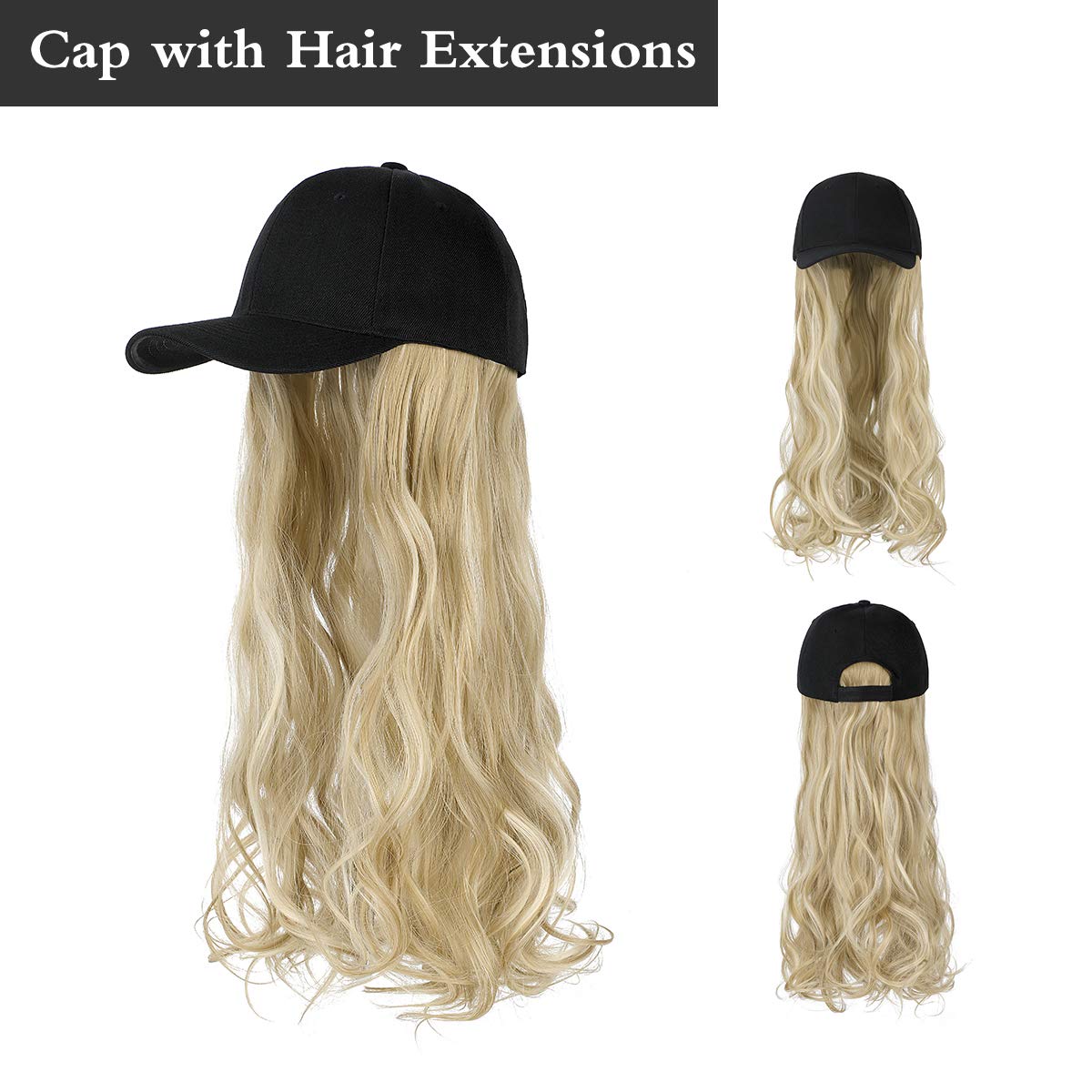 Baseball Cap with Hair Extensions for Women Adjustable Hat with Synthetic Wig Attached 24inch Long Wavy Hair Black Baseball Cap(Ash Blonde Mix Bleach Blonde)