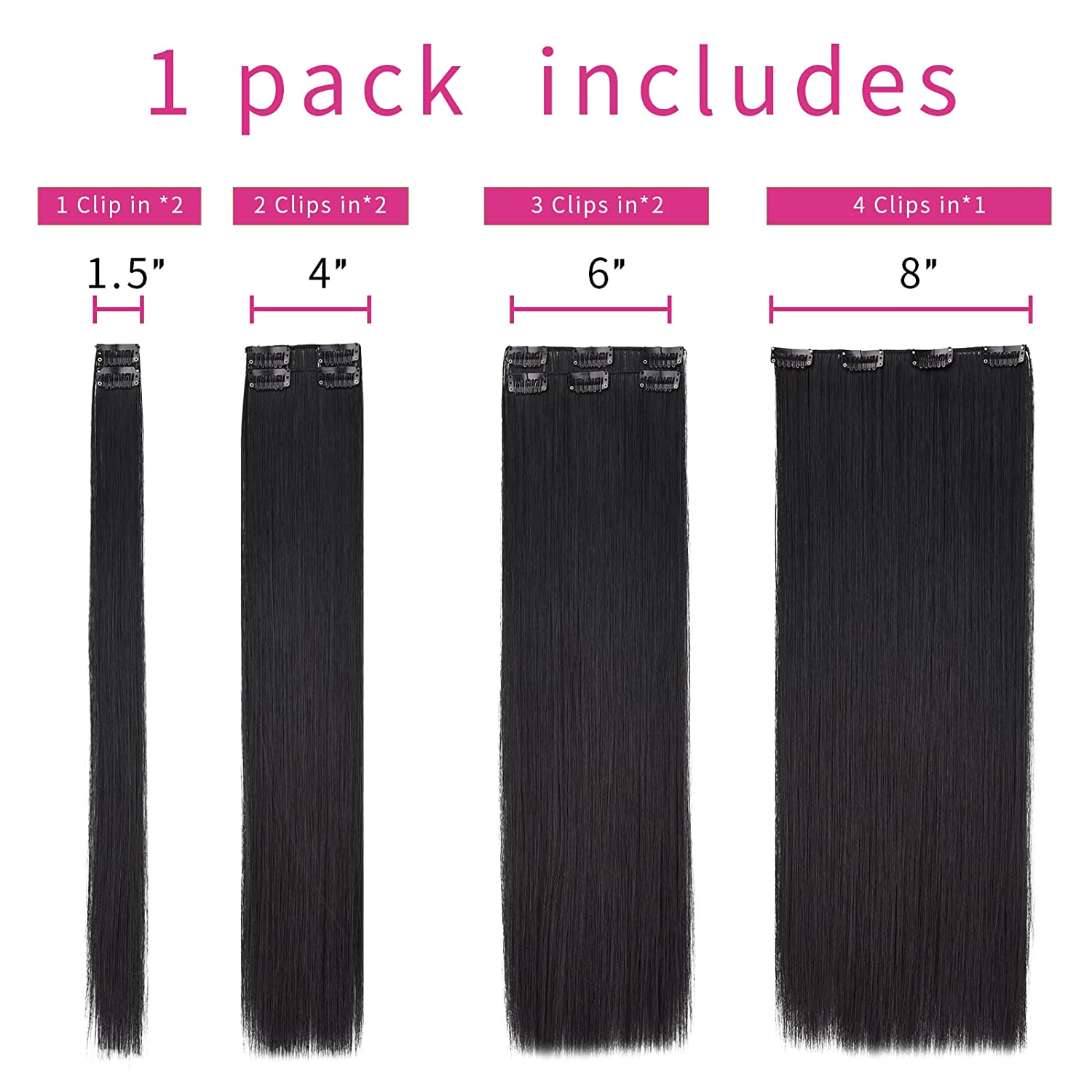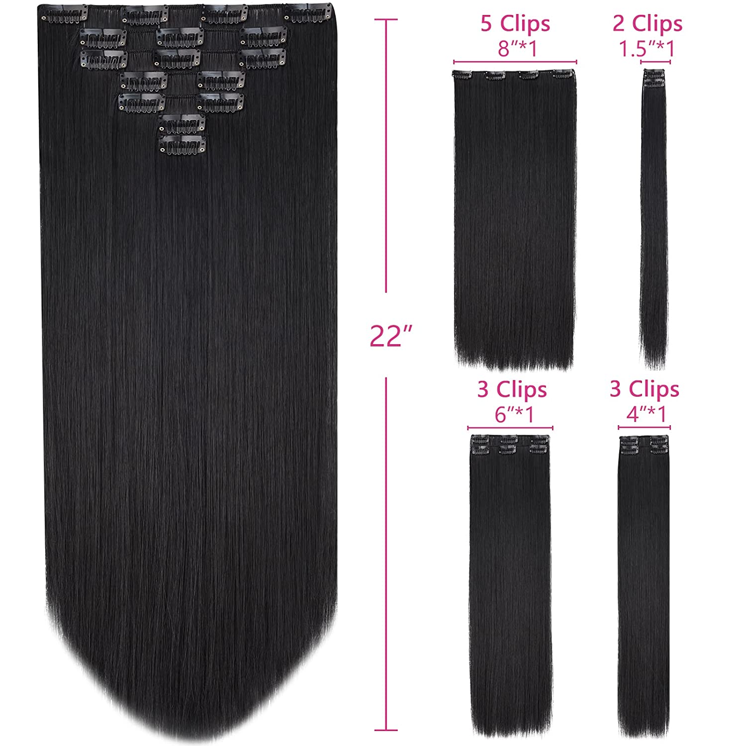 Hair material: black hair extension products are made of synthetic materials, this clip hair extension is fluffy and realistic, easy to comb and not easy to knot, a pack of 2; each weight is 5(OZ), suitable for women and girls with less hair, if your hair volume is partial Less, just use 2 of them. If you have a lot of hair, you can use it instead.