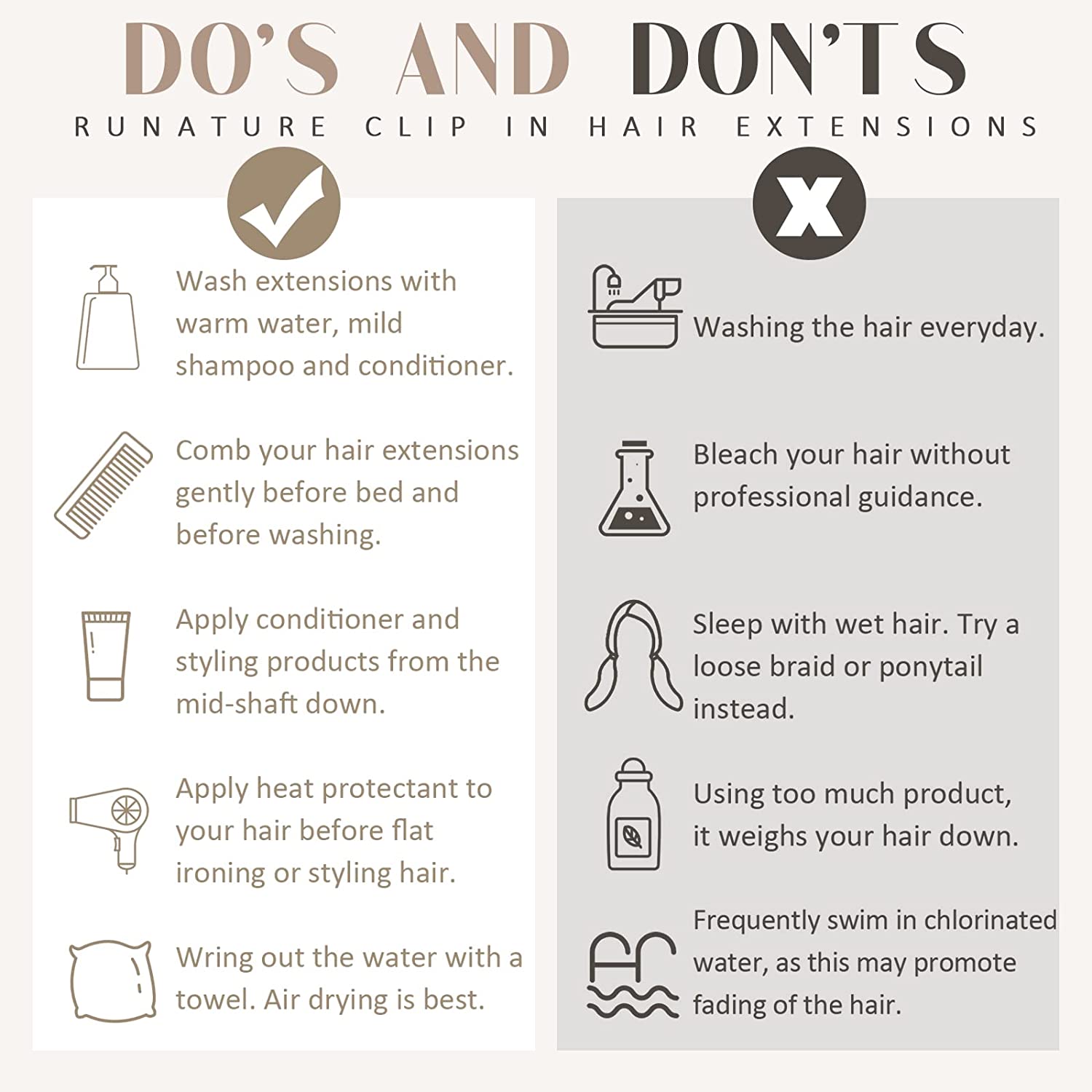 - WARM TIPS:Human hair clip in extensions should be washed by mild shampoo and conditioner as your own hair.Do not grab the wet hair extensions violently.It is best to dry naturally.
