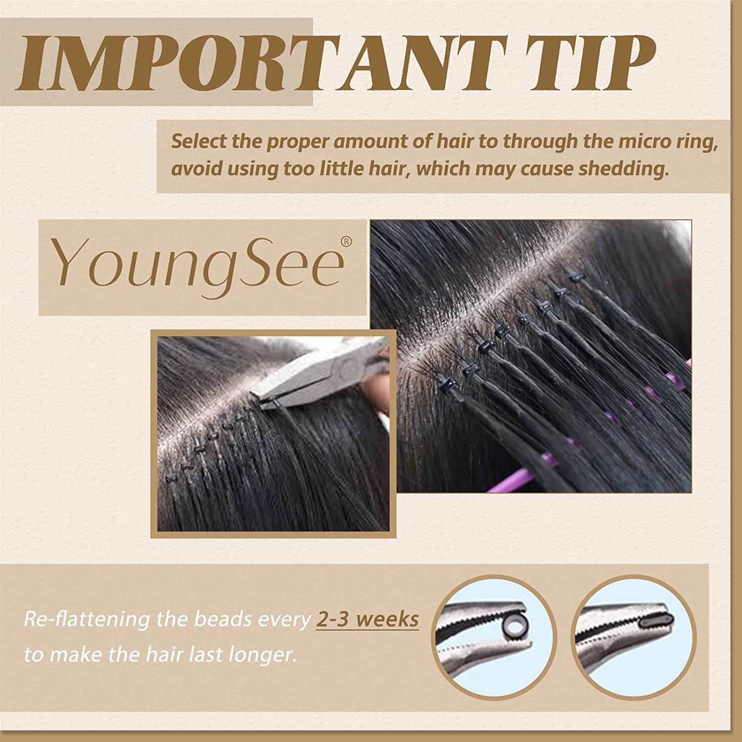 - 【Important Tip】After wearing for a period of time, due to shampooing, combing, sleeping and other reasons, the beads may become loose, so we recommend re-flattening the beads every 2 weeks to make the hair last longer.
