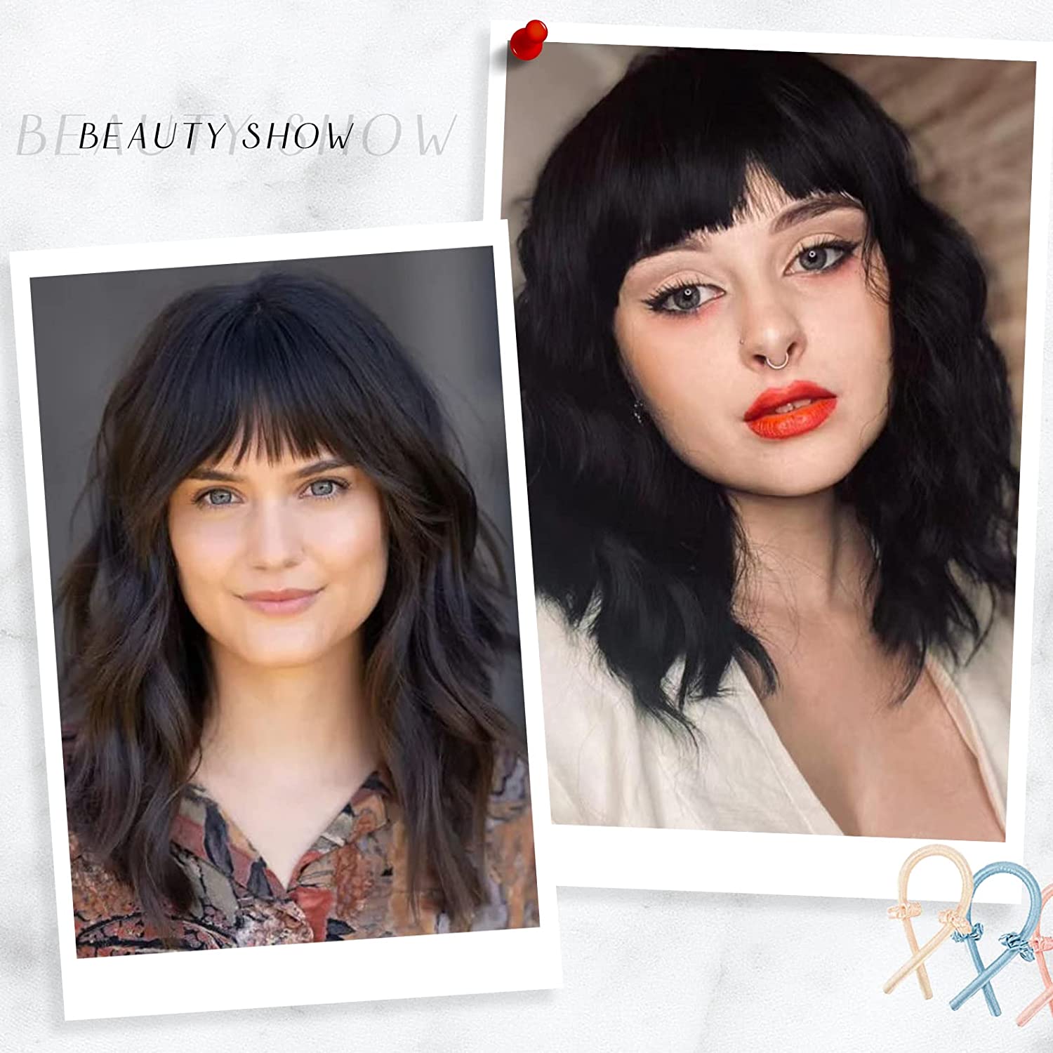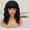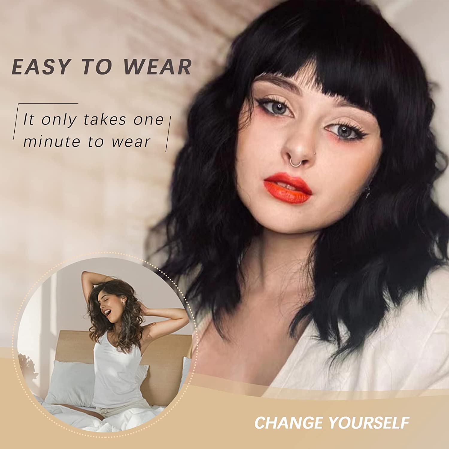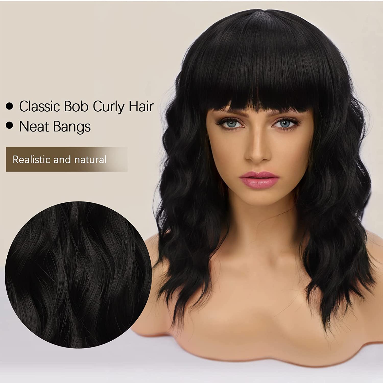 Black Wavy Wigs with Bangs Women’s Short Black Bob Wig Synthetic Natural Looking Heat Resistant Fiber Hair