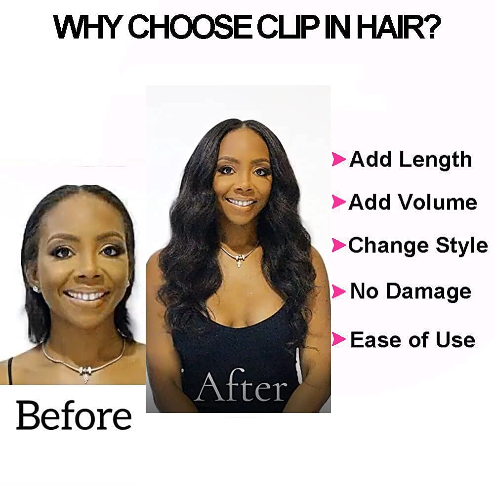 - ★Warm tips: 120g(4.2 oz)/ 8 pieces / 18 clips per set. Kinky Straight clip ins extensions for black women Available from 12 inches to 24 inches. According to your own hair volume, usually 2 packs can fill your head, increasing length and volume. If you like thicker hair, it is recommended to buy 3 packs.