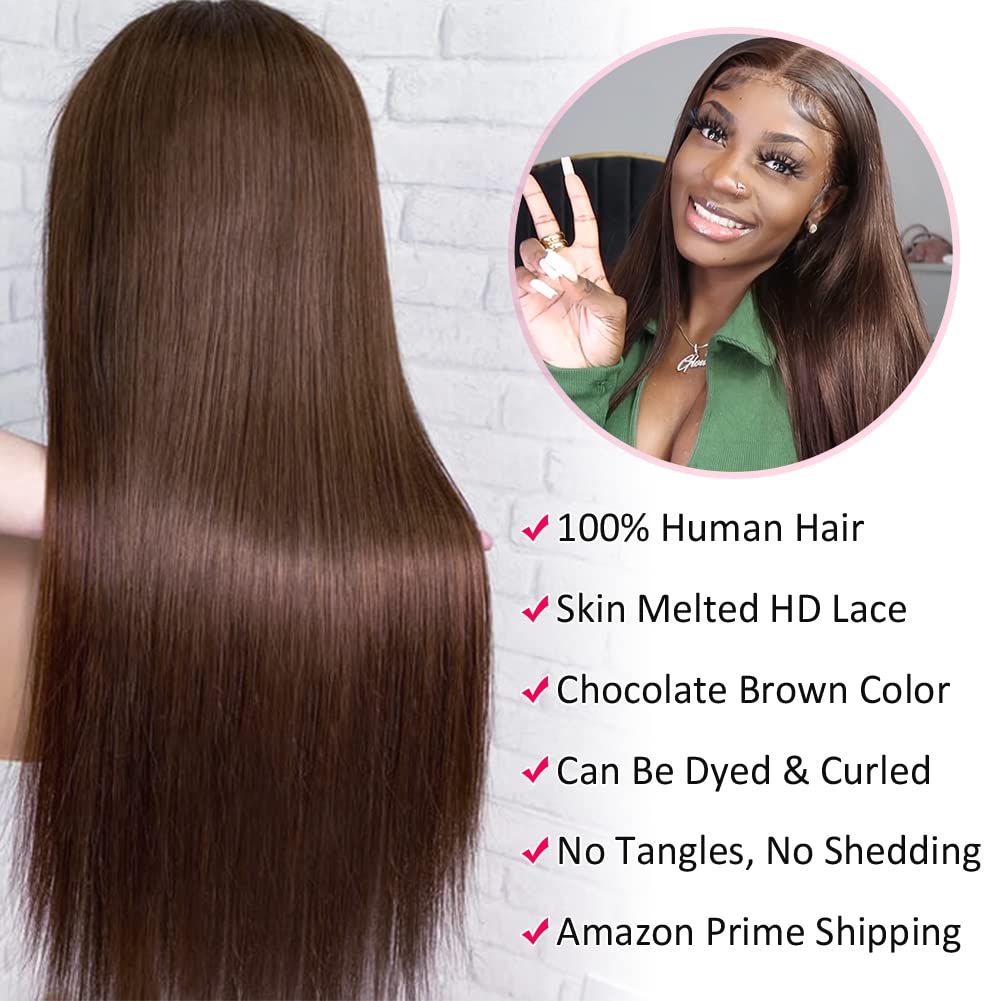Chocolate Brown Straight Lace Front Wigs Human Hair Preplucked 13×5 HD Transparent Lace Frontal Wig 150% Denstiy Colored Human Hair Wigs for Black Women with Baby Hair