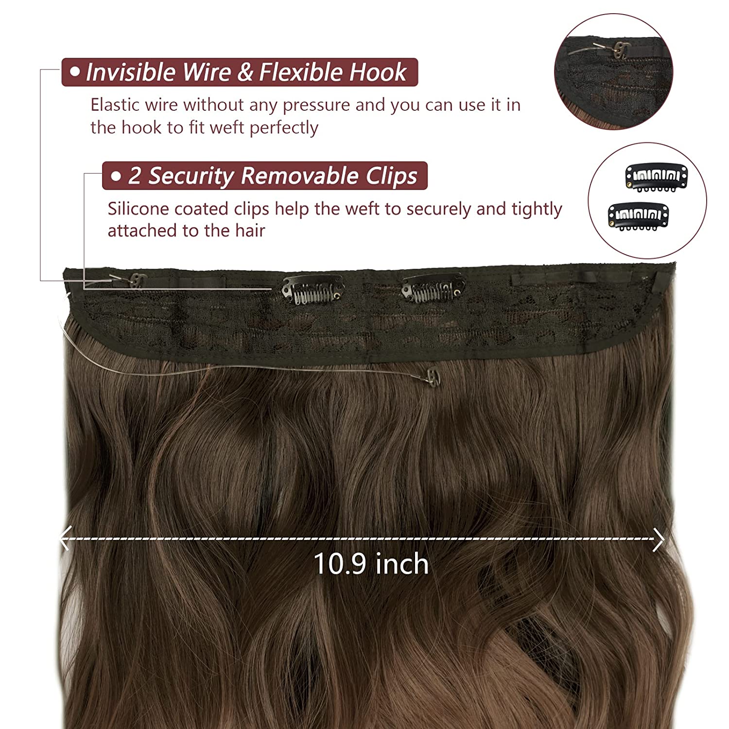 - Double Fixation for Better Secure – Invisible wire has strong toughness, not easy to break, sits flat against head and there is no gapping. Extra 2 security removable clips added on either side of the weft will keep the hair extension stay in place and not slip or fall out of your hair.