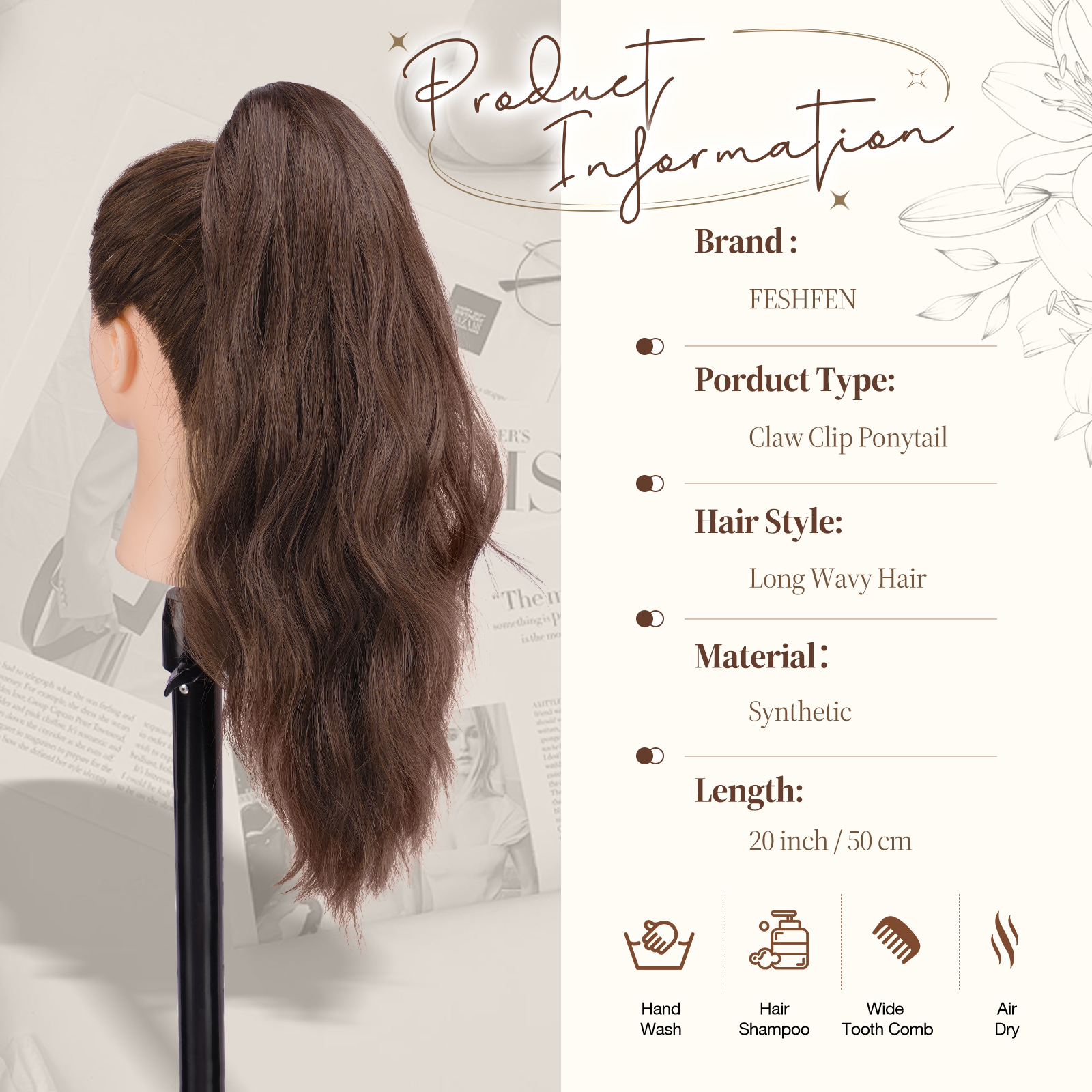 FESHFEN 20 inch Ponytail Extensions, Long Claw Clip in Ponytail Hairpiece Synthetic Pony Tails Hair Piece Natural Wavy Hairpieces for Women