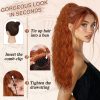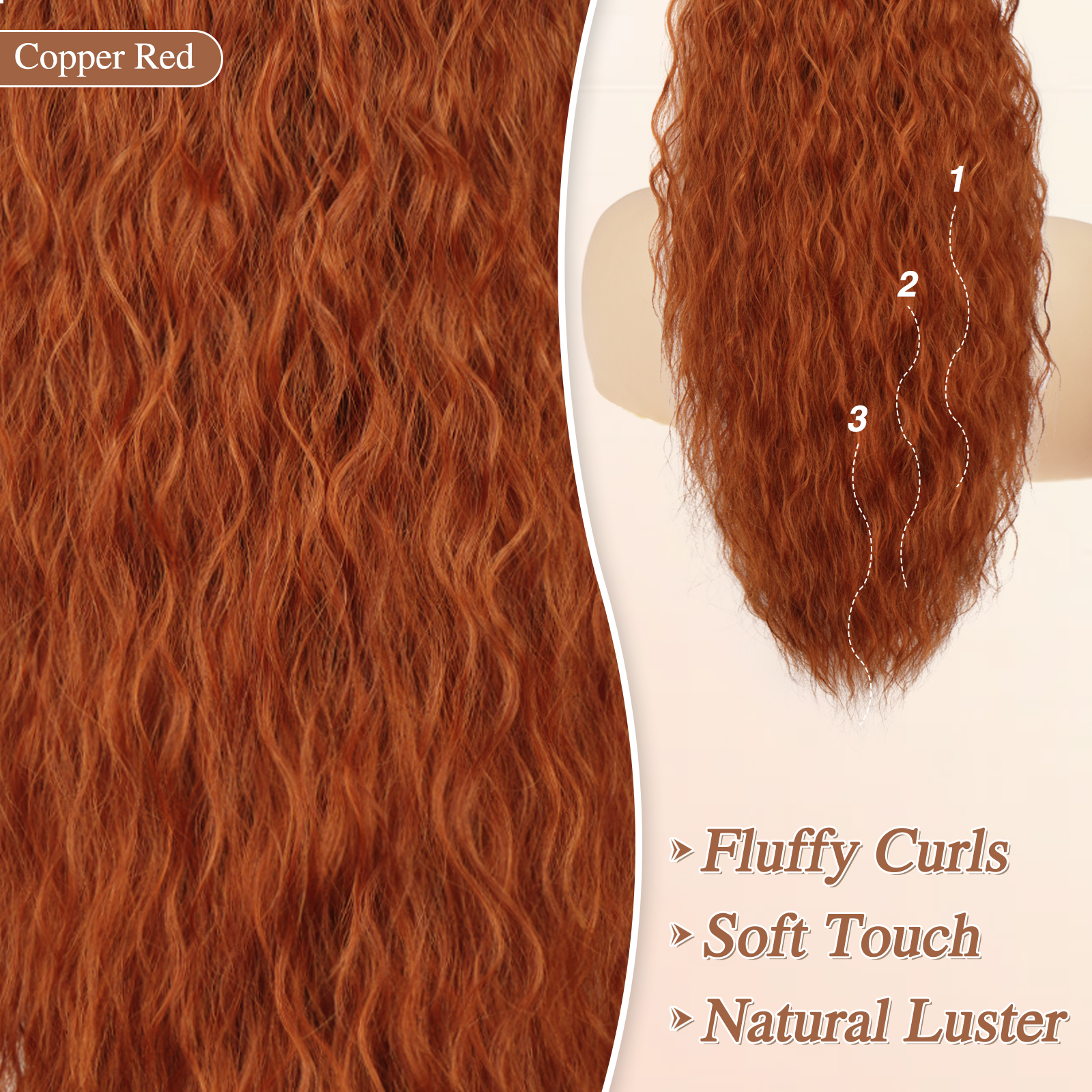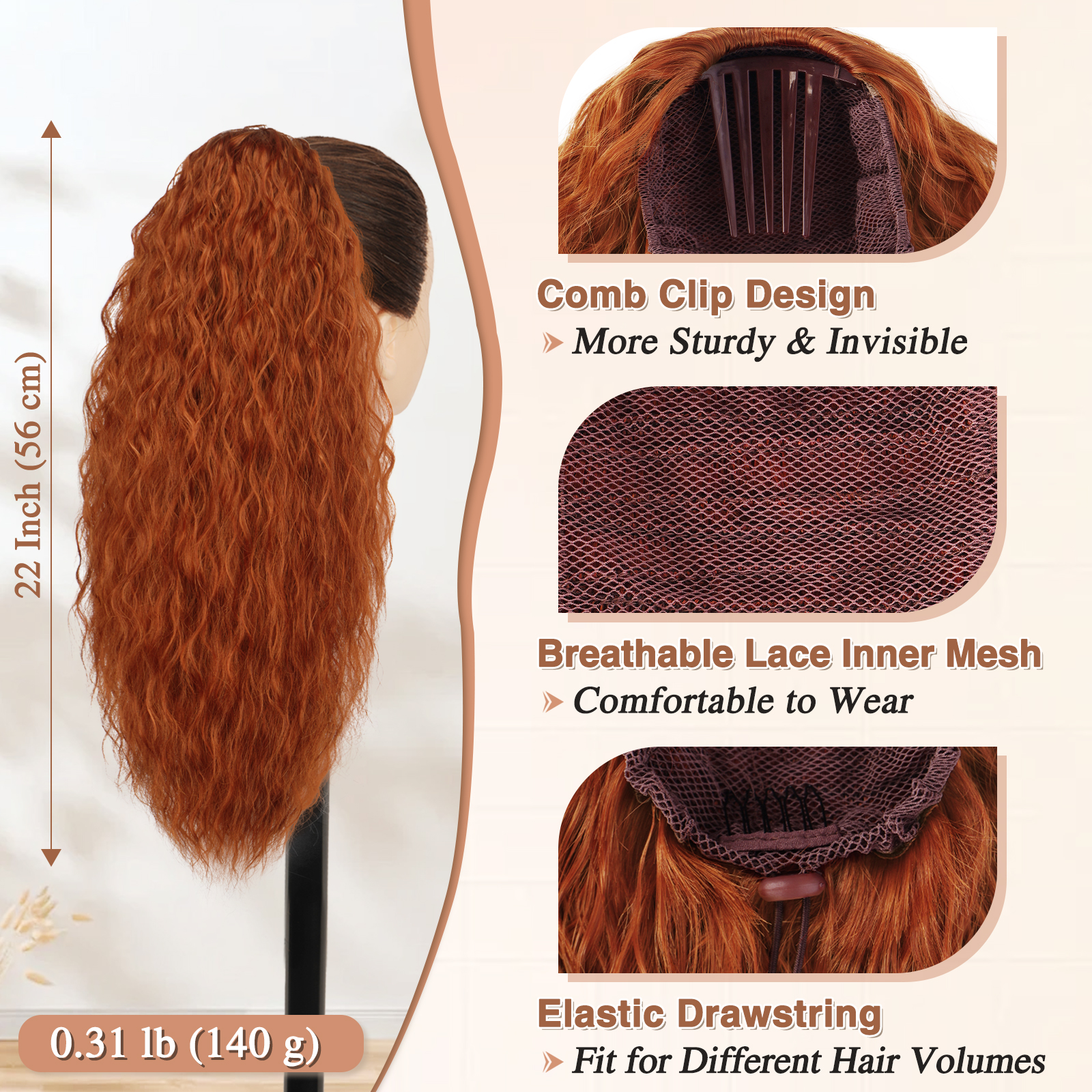 FESHFEN Copper Red Curly Wavy Drawstring Ponytail Extension – 22 Inch Synthetic Comb Clip in Ponytails Hairpiece for Women – Voluminous Natural Looking Ponytail Hair Extensions Fake Ponytails