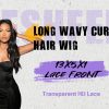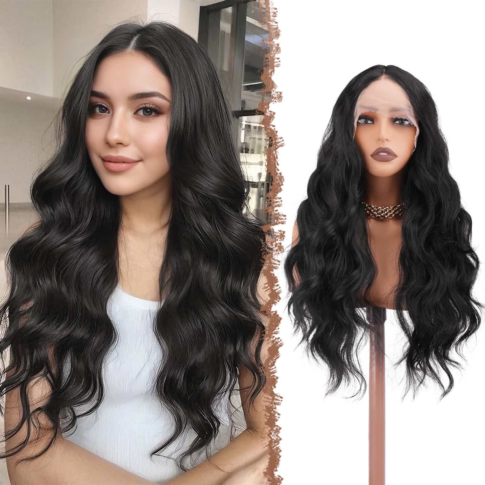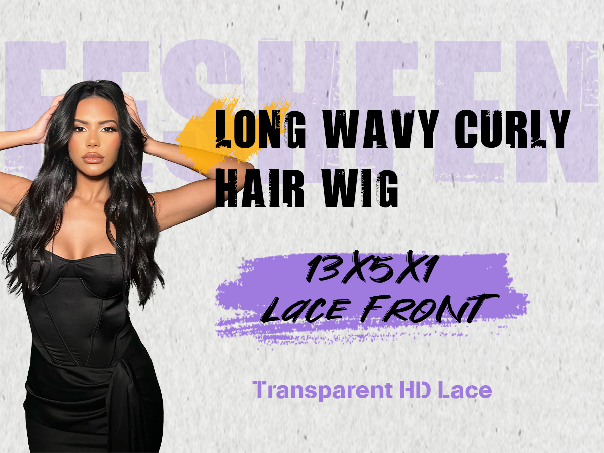 FESHFEN Lace Front Wig –Natural Black 28inch Long Curly Wavy Synthetic Hair Wigs with 34x11x3 cm HD Lace Wig for Women
