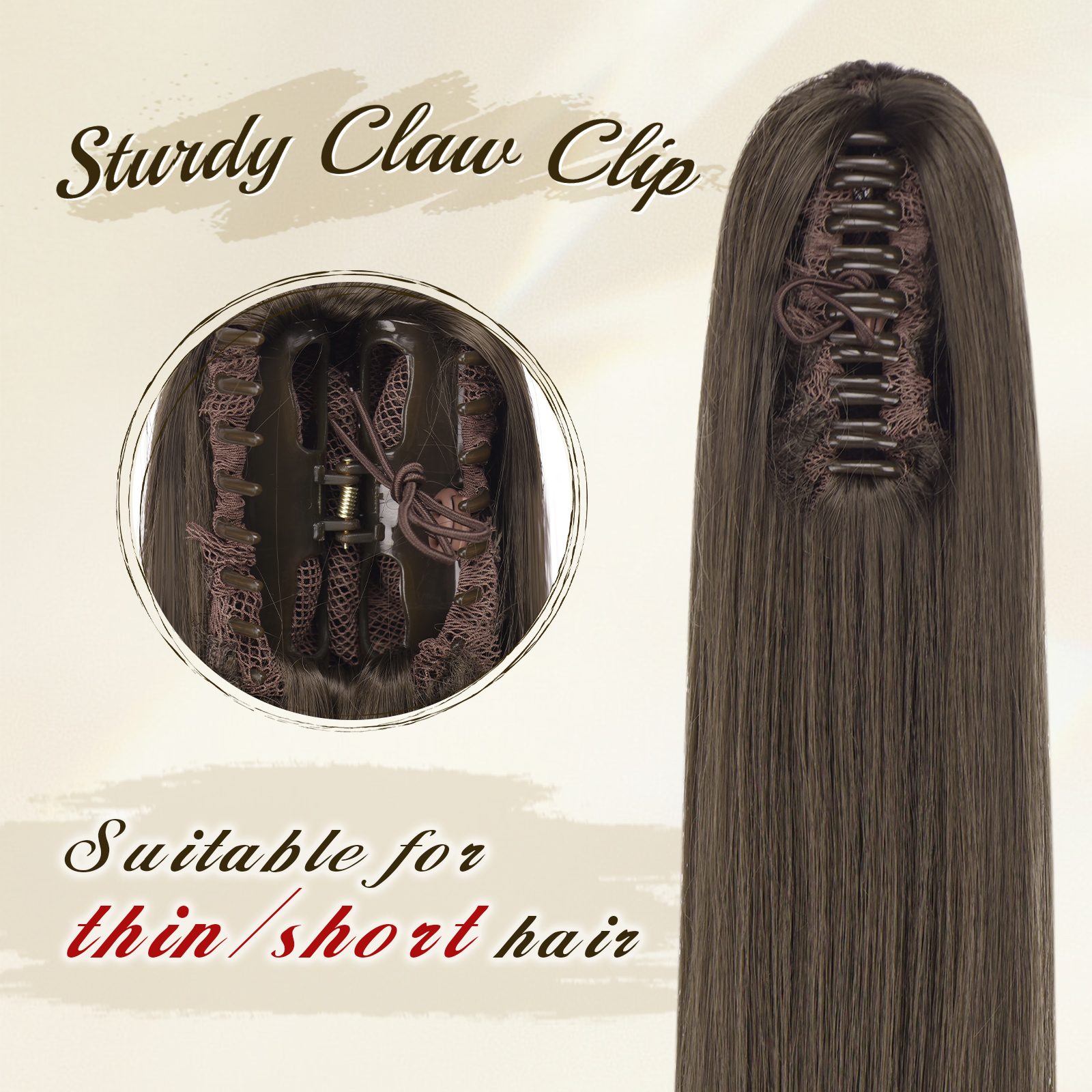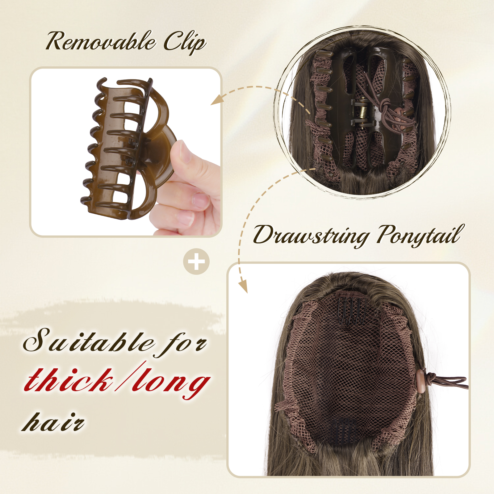 2-in-1 Ponytail Design: Claw Clip & Drawstring – The claw clip can be removed and replaced with a drawstring, allowing this ponytail hairpiece to be styled either as a clip-on or a drawstring, making it ideal for short, thin, or fine hair.