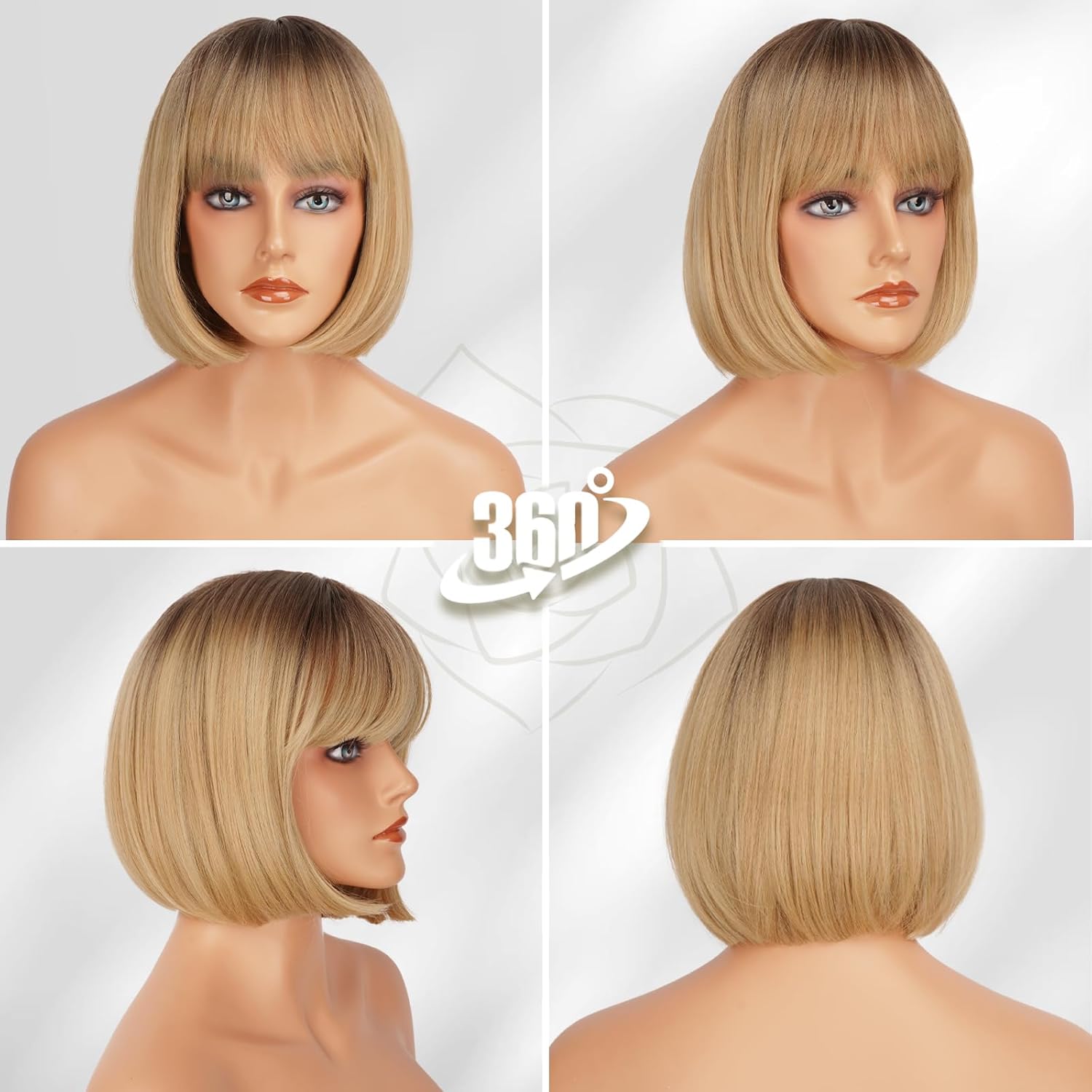 FESHFEN Short Bob Wig with Bangs – Ombre Blonde Bob Wig for Women – Heat Resistant Synthetic Hair with Brown Roots – 12 Inch