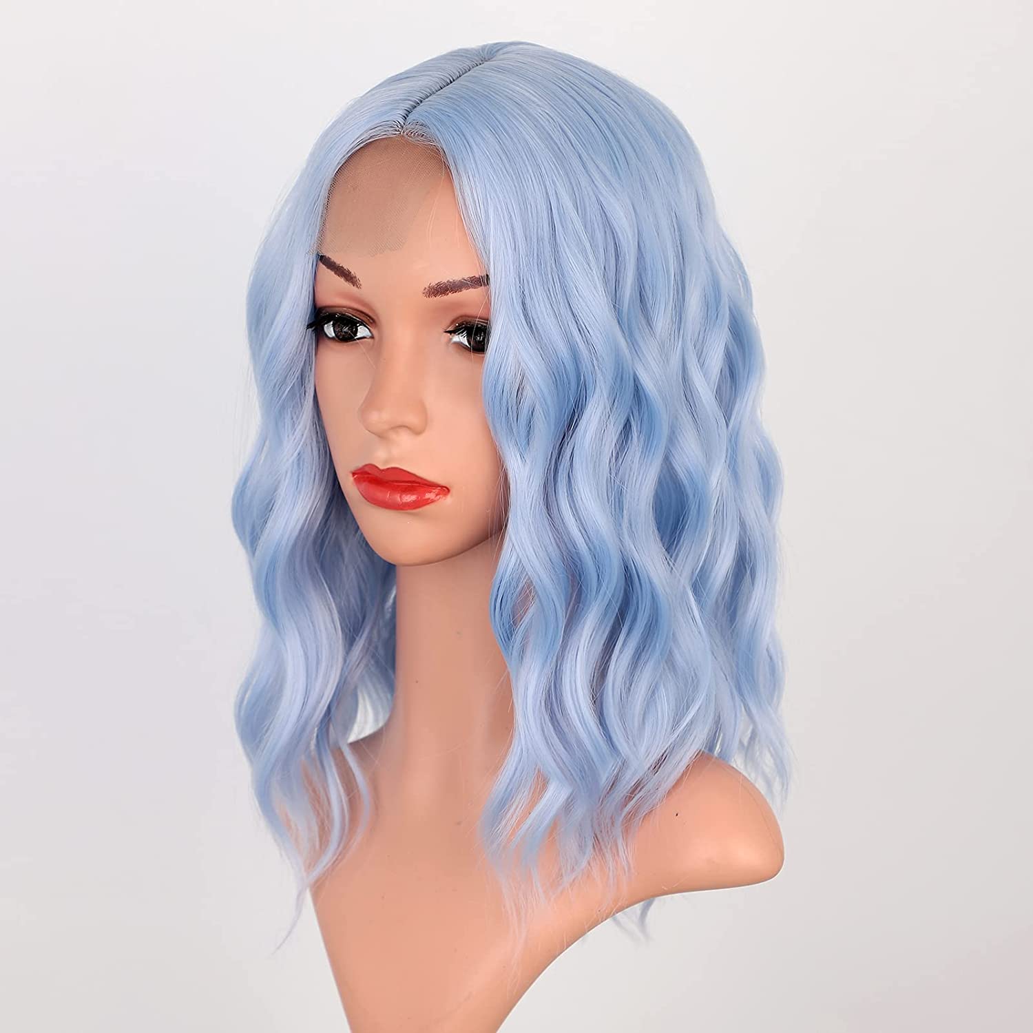 Glorious Light Blue Short Wavy Wigs for Women Blue Curly Wig for Girl Middle Part Bob Blue Wig Synthetic Wavy Wig Cosplay Party Use