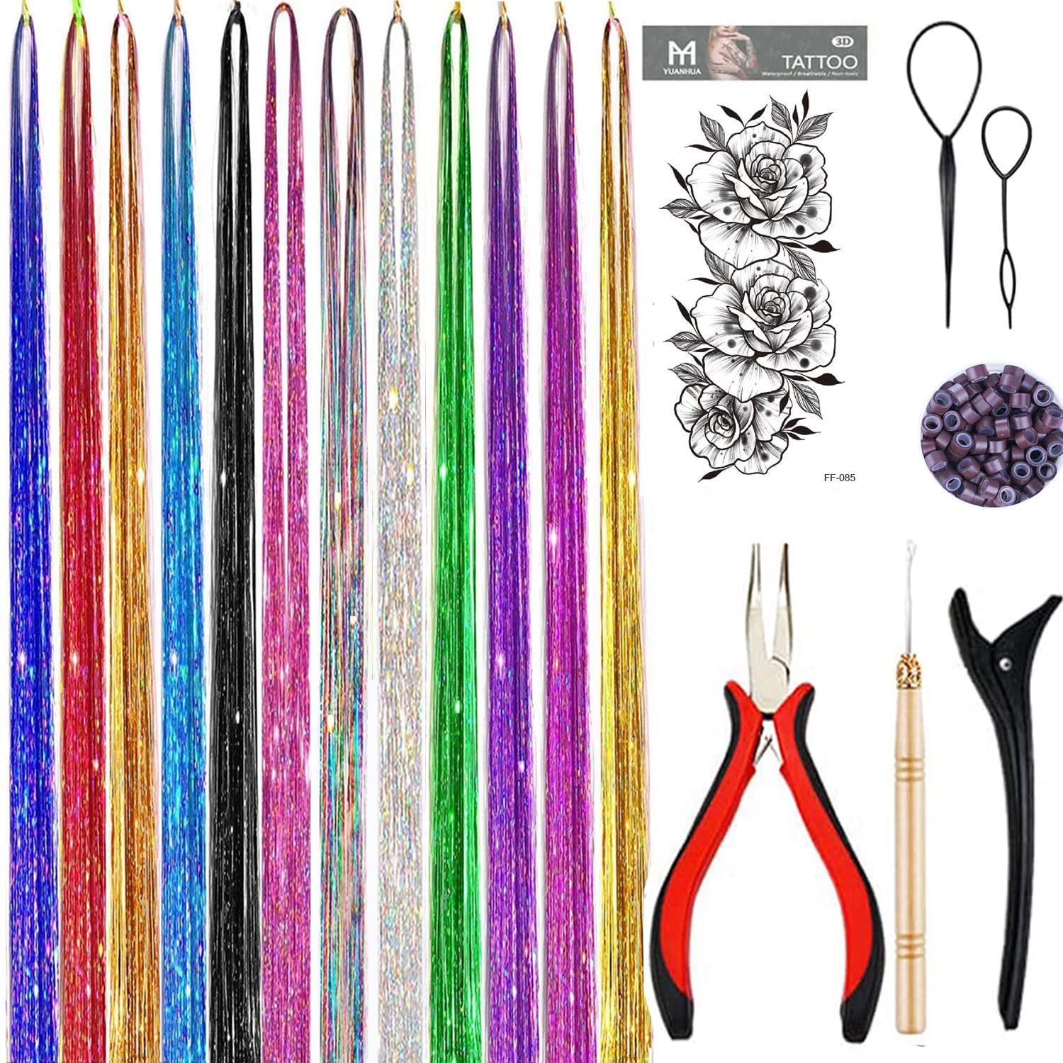 - ✅12 Colors 3000 strands tinsel hair extensions, each Color Has 250 Strands, 1 piece crochet, 1 piece tweezer, 100 pieces micro silicone link rings beads, 1piece hair clips, 1pieces tattoo sticker, 2 Pairs Hair Tail Tools as a gift.