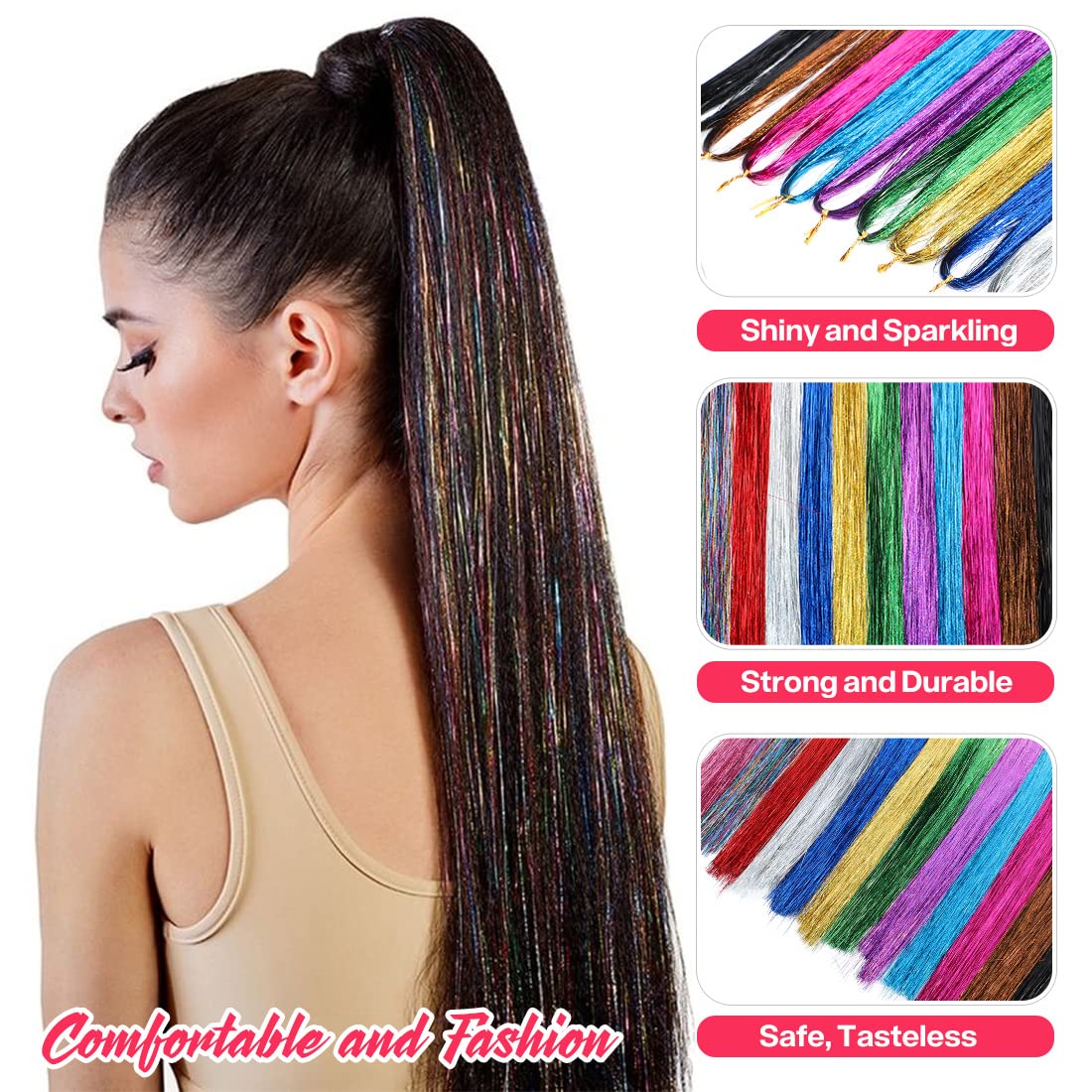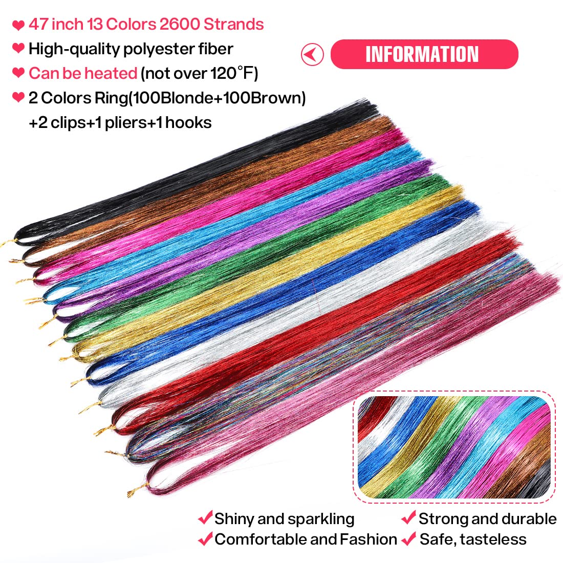 - 🔥Size And Material:Each tinsel hair extensions are individually packaged, the length of 47 inches is enough to cut the length that suits your hair,These tinsel hair extensions are made of High temperature tinsels, tasteless and will not fade,They can be washed, blow-dried and combed.