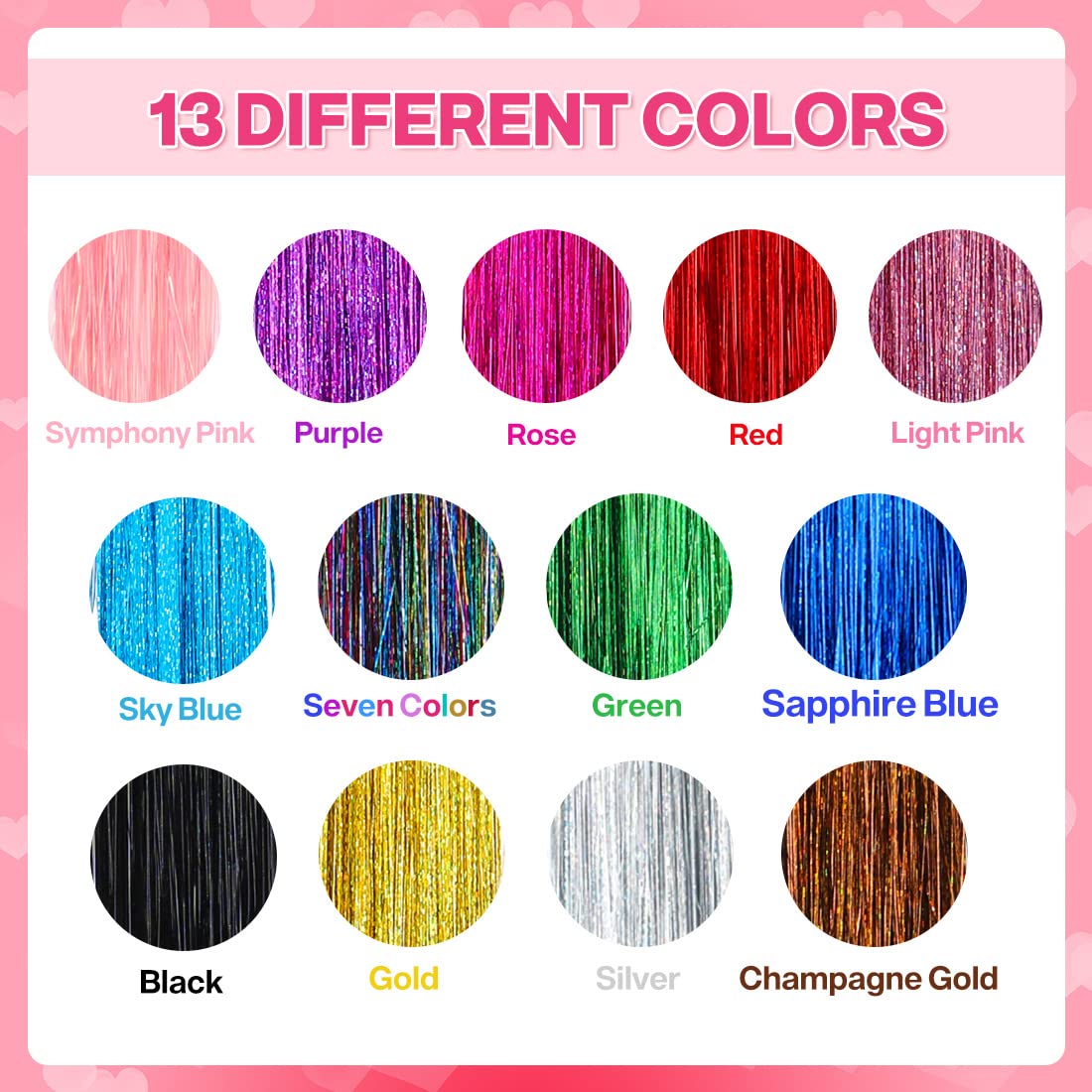 - 🔥13 Tinsel Hair Extensions Colors:red,purple,rose,pink,light pink,sky blue,seven colors,green,sapphire blue,black,gold,silver,champagne gold.