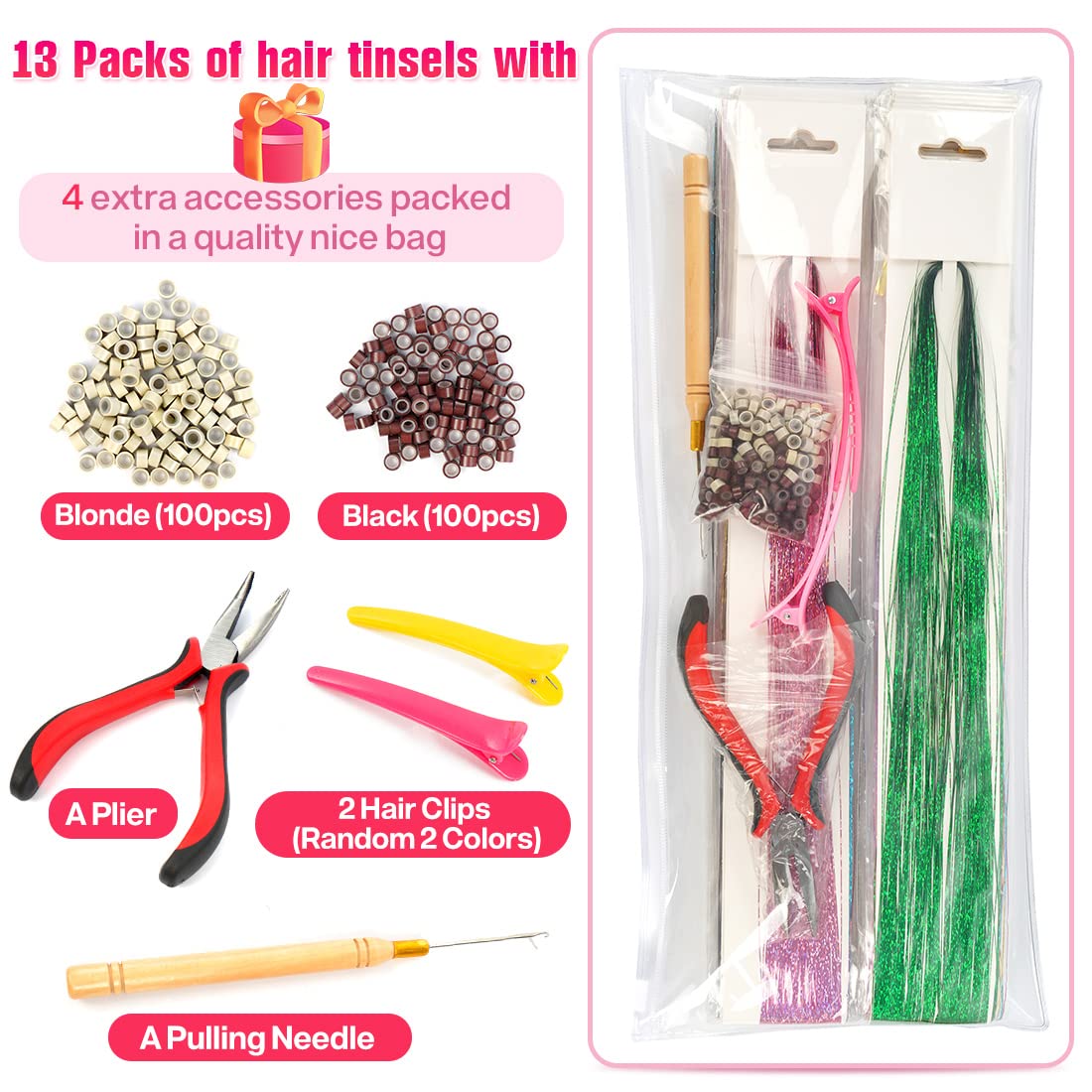 - 🔥Package :13 Colors 2600 strands hair tinsel kit, come together with hair extension tools, includes 1 piece crochet, 1 piece forceps, 200 pieces micro silicone link rings beads,You can install and use it easily.