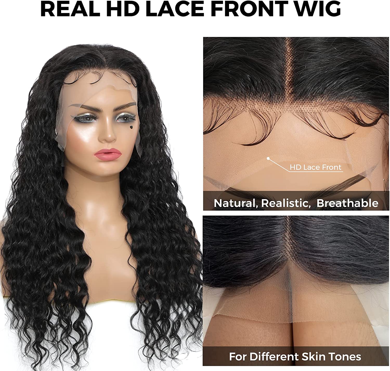 - 🌹【13×6 HD lace front wigs human hair】:HD lace front wigs human hair length(14-28inch). water wave human hair wig color(Natural black). curly human hair wig density(150%)comforable&natural.medium size cap:55-57cm circumference,3 combs&2 elastic adjustable straps,comfortable and natural and durable.