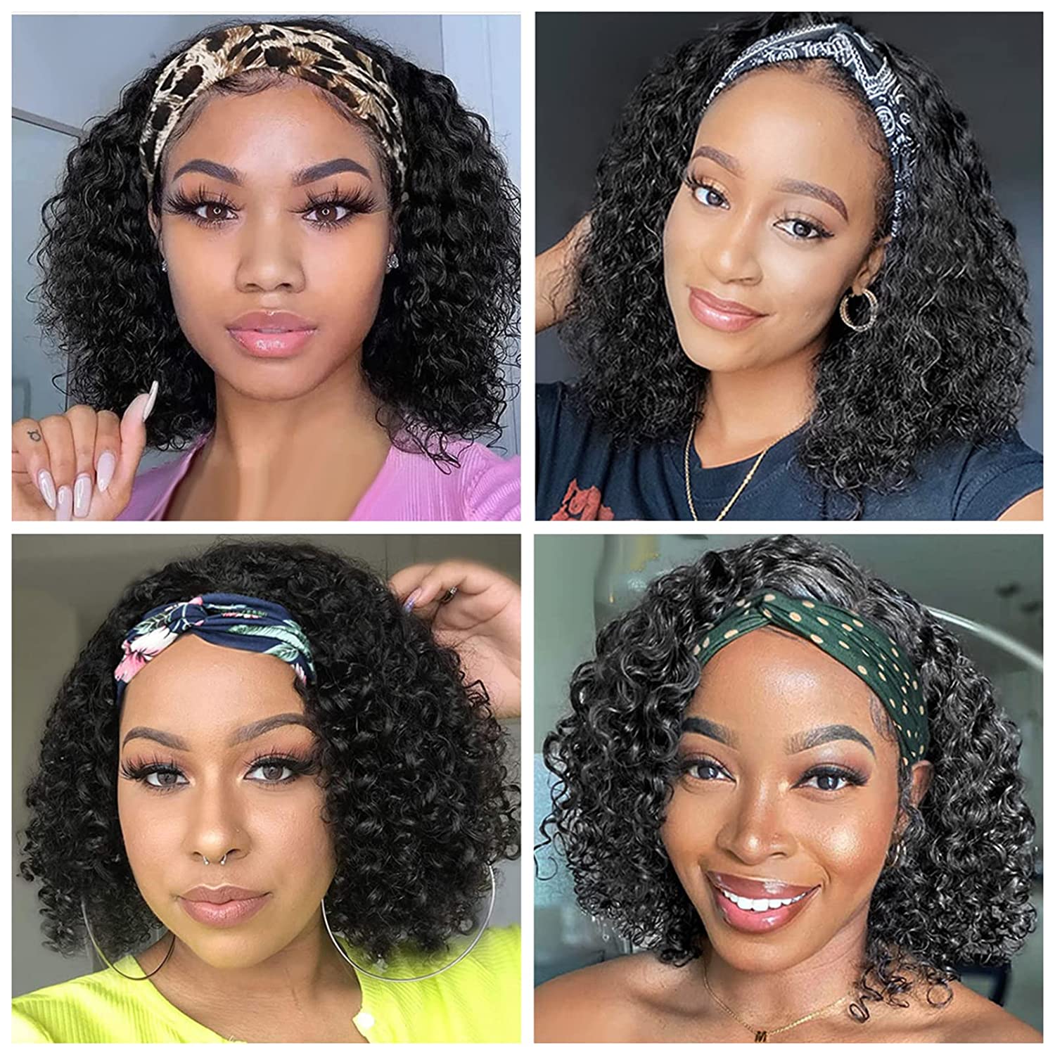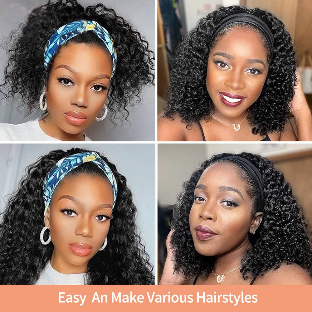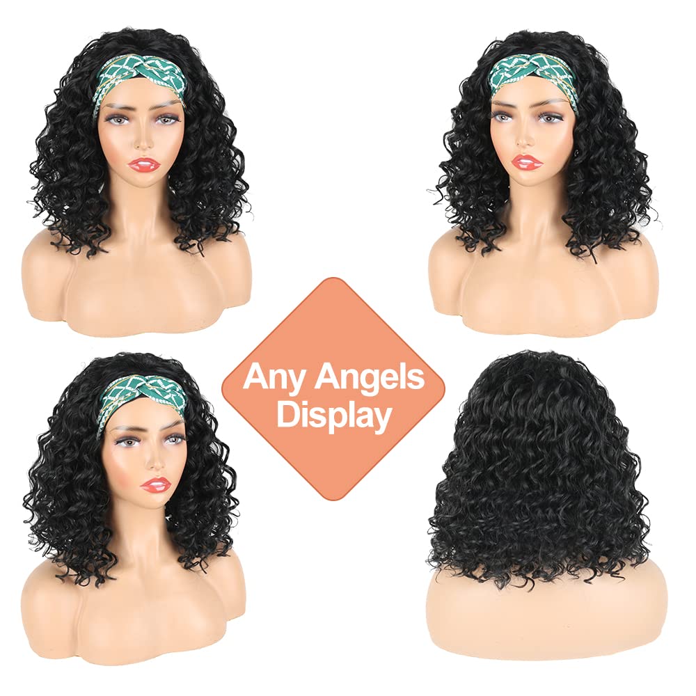 Headband Wigs For Black Women, Curly Headband Wig Glueless Non Lace Front Wigs. Kinky Synthetic Brazilian Hair Wigs With Headbands Attached. Wavy Headbands For Wigs Natural Black Color, 14 Inch.