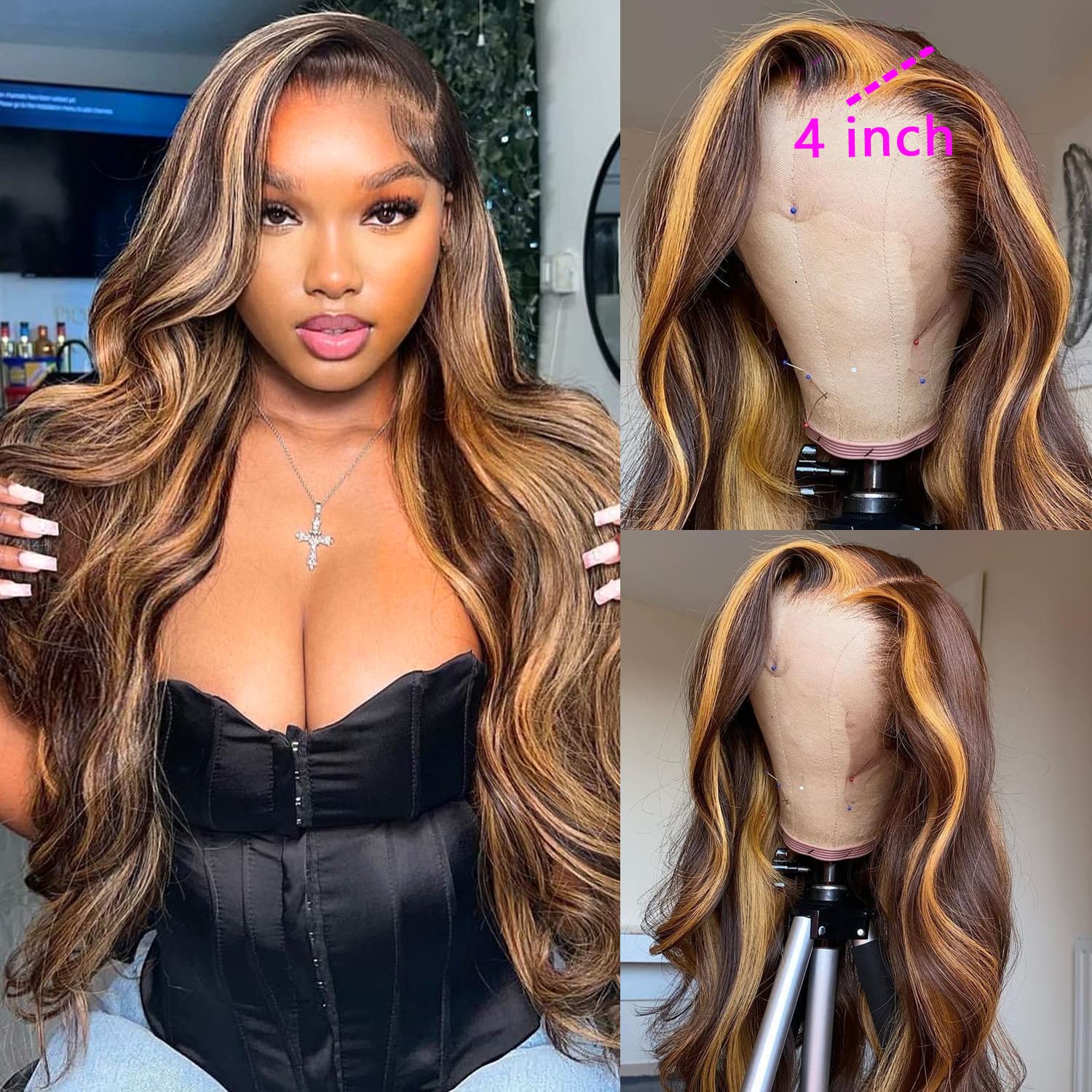 Highlight 13×4 Lace Front Wigs Human Hair Ombre 4/27 Colored Honey Blonde Frontal Wigs Pre Plucked with Baby Hair 150% Density Body Wave Human Hair Lace Front wig for Black Women 26 inch