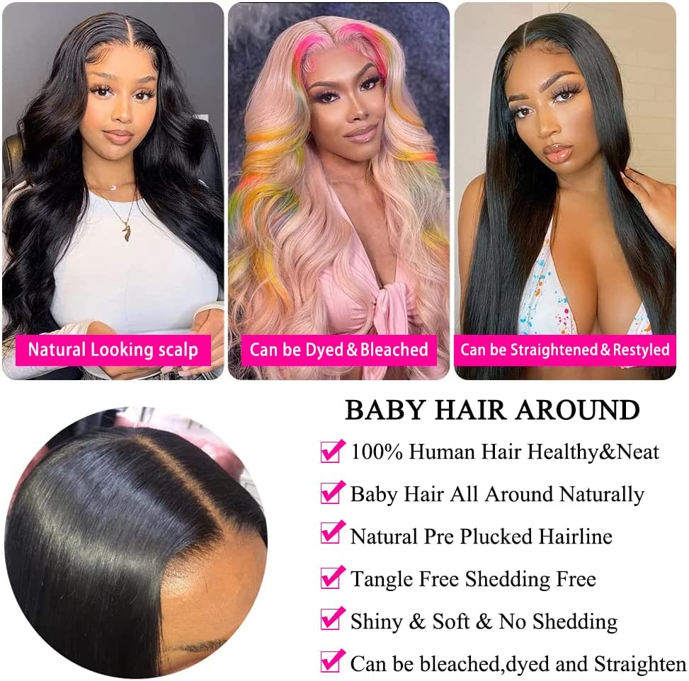 • 💗🧡All natural high quality hair,this Body Wave Lace Front Human Hair Wigs gives you beautiful results that looks 100% natural,No Tangle / No Shedding / No Lice / No Smell , Super Soft,It can be straightened, curled, dyed and styled.Lace Front Wigs Human Hair with Baby Hair Pre Plucked Bleached Knots.Last for Long with Good Hair Care.