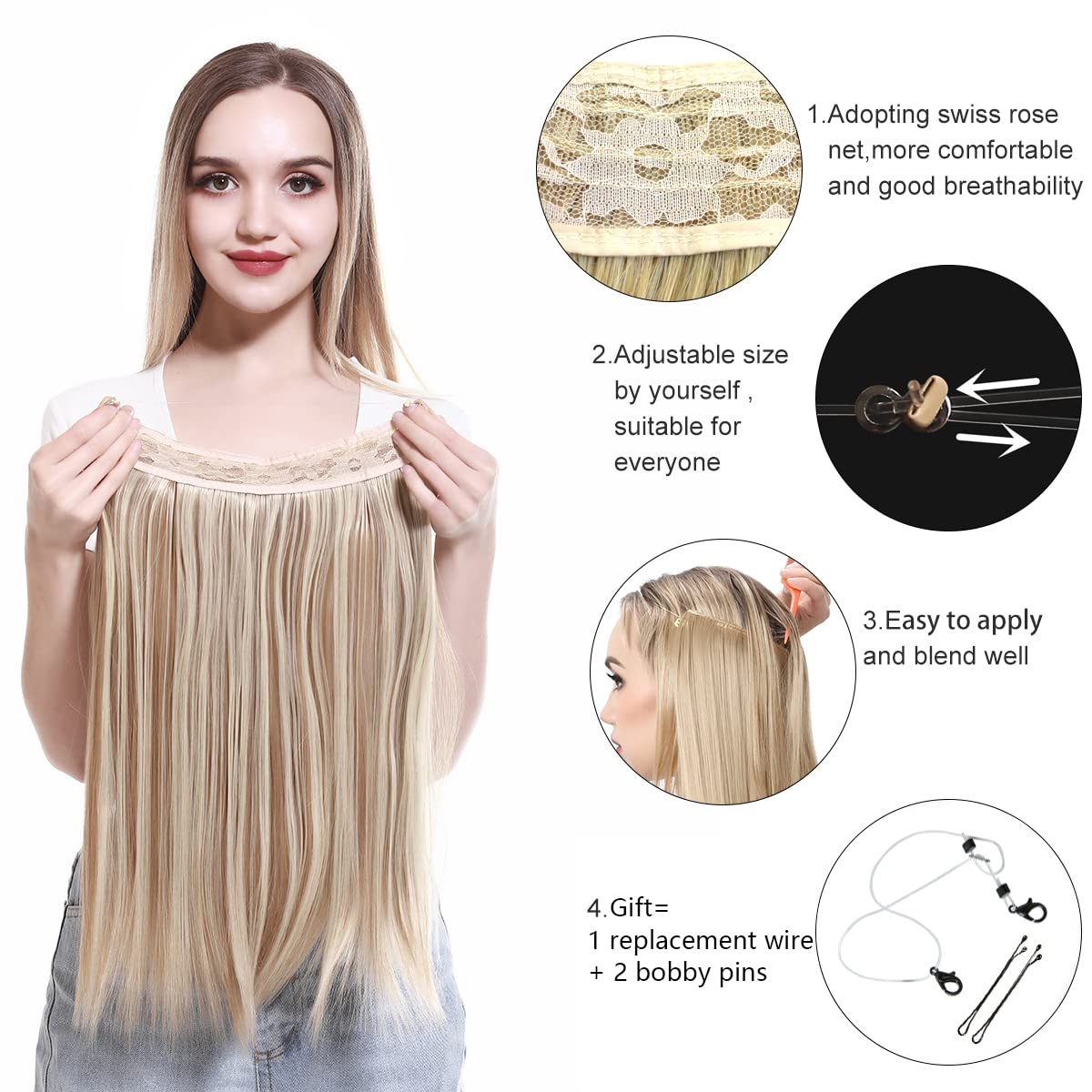 Invisible Wire Hair Extensions Dark Brown With Beach Blonde Highlight Straight Long Synthetic Hairpieces 22 Inch 4.2 Oz Adjustable Headband For Women Heat Resistant Fiber No Clip