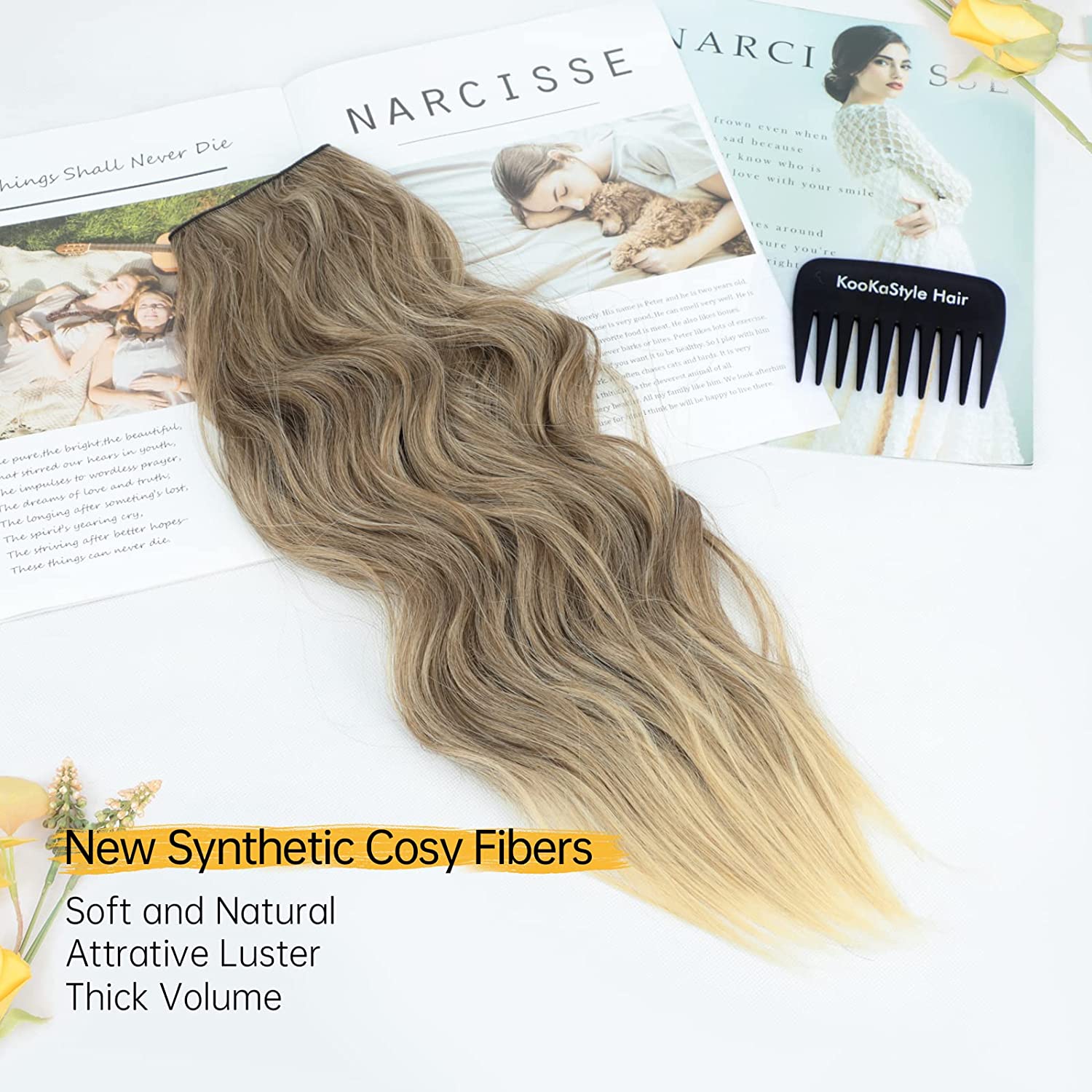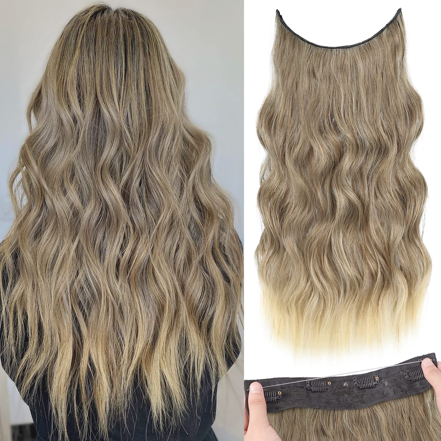 Invisible Wire Hair Extensions With Transparent Wire Adjustable Size 4 Secure Clips Long Wavy Secret Synthetic Hairpiece 20 Inch Ash Brown Mix Bleach Blonde For Women