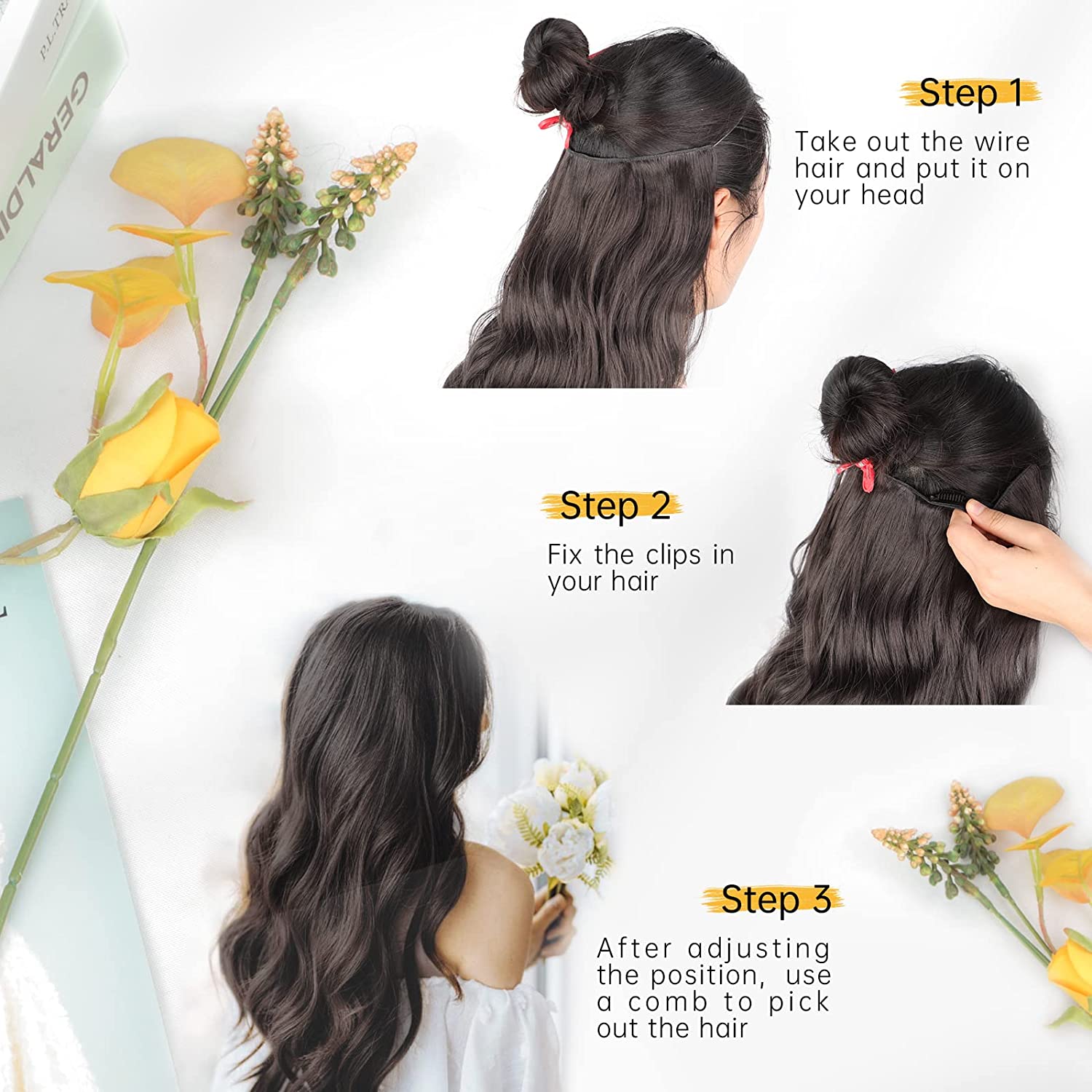 • Easy to Apply: 1. Position the wire hair extensions over your head like a headband. 2. fix the 4 clips in your hair. 3. Use your own hair to hide the wire. Taking less time for instantly thicker and longer hair in few minutes.