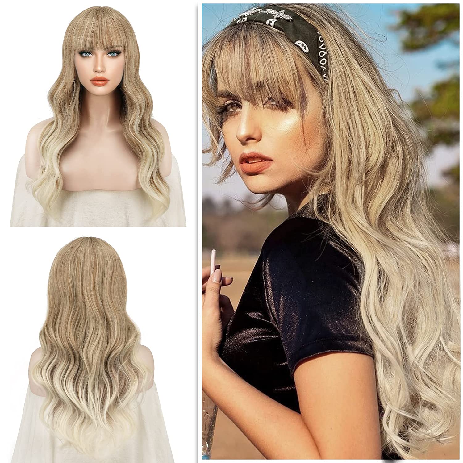Ombre Wig with Bangs Long Curly Wavy Synthetic Wigs for Women Blonde Hair Wig Heat Resistant Colorful Natural Wavy Wigs Daily Party Wigs 24 Inches Ash Blonde