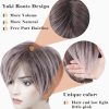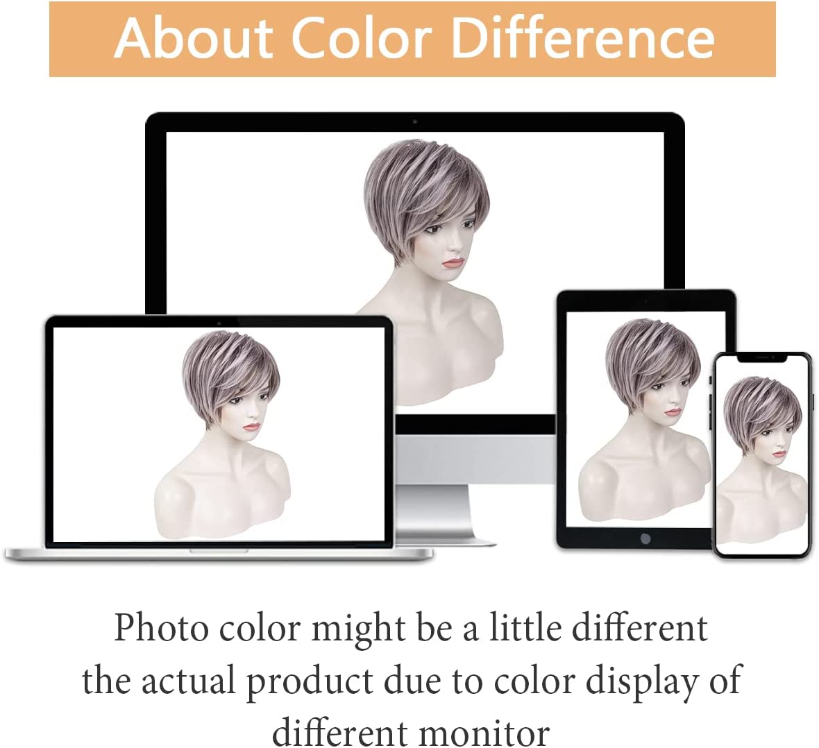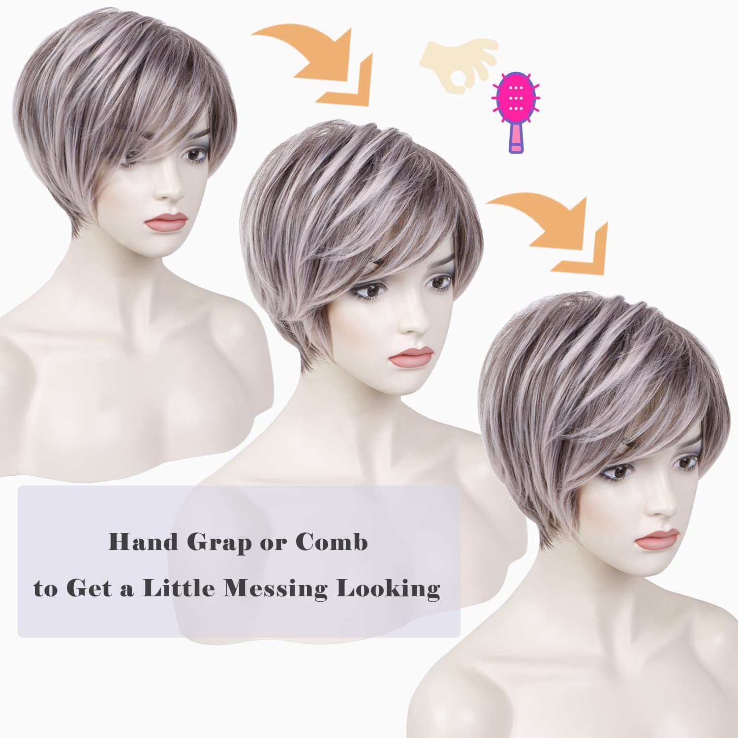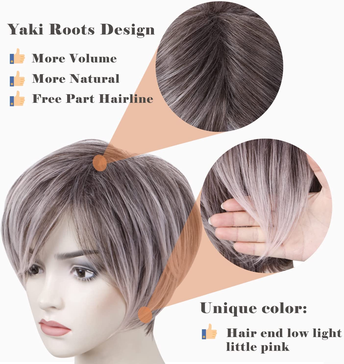 - Cool-Toned Grey Balayage Pixie Wig: Short layer boy cut style, Brown mix grey Color and hair end lowlight little pink looks sassy.Suitable for most people, not only for grandma, more and more young people like this color and design.