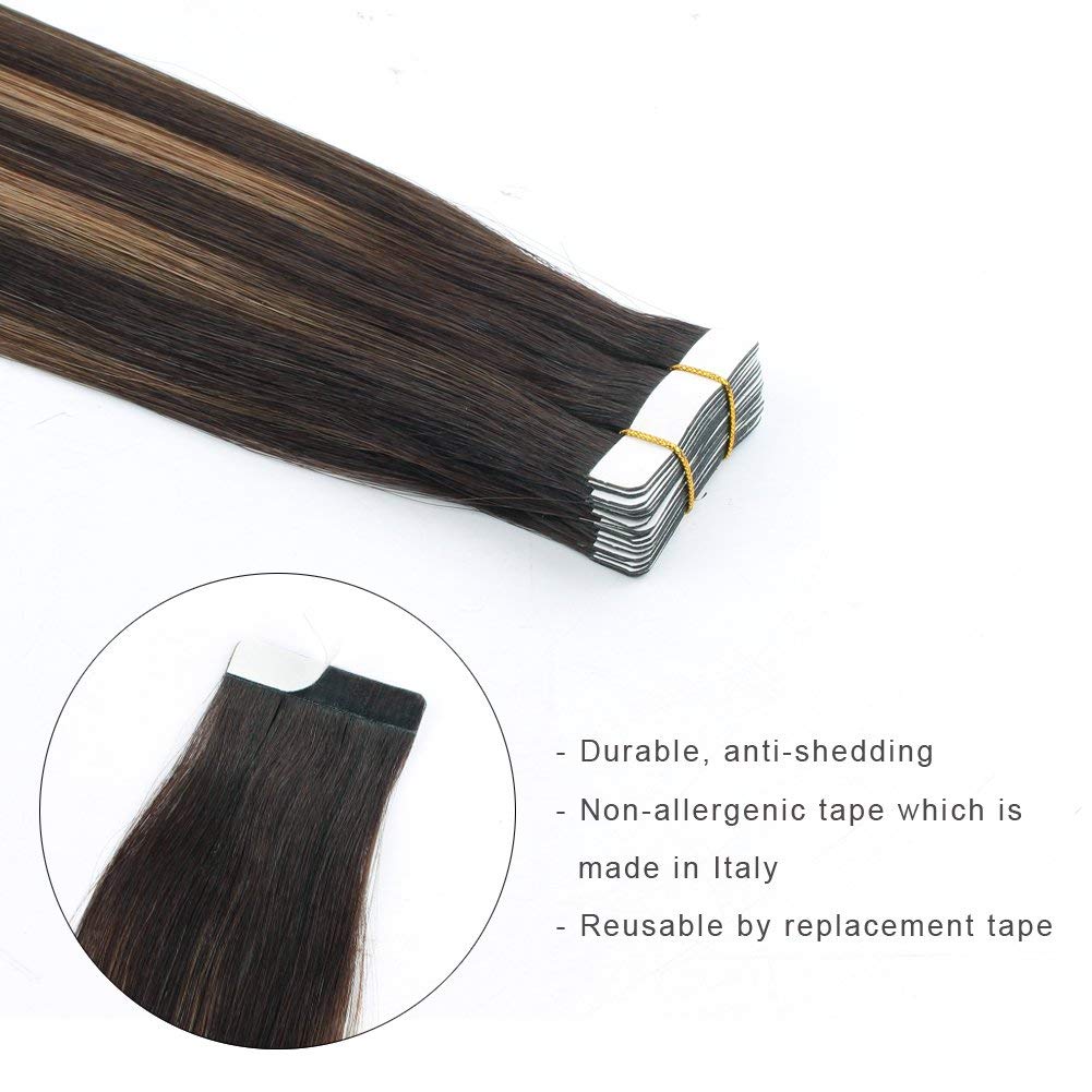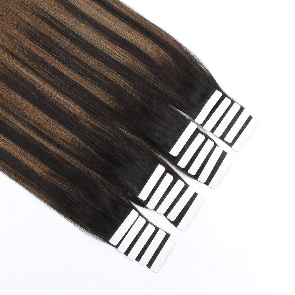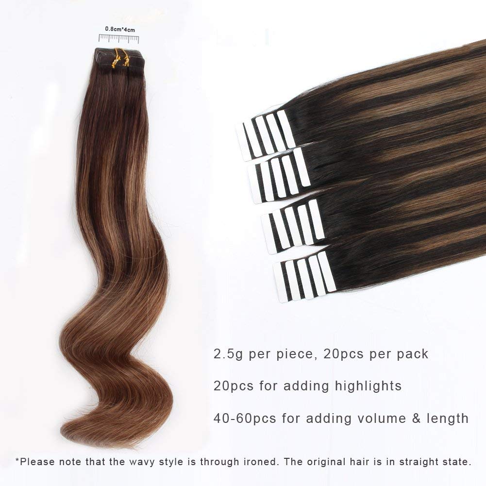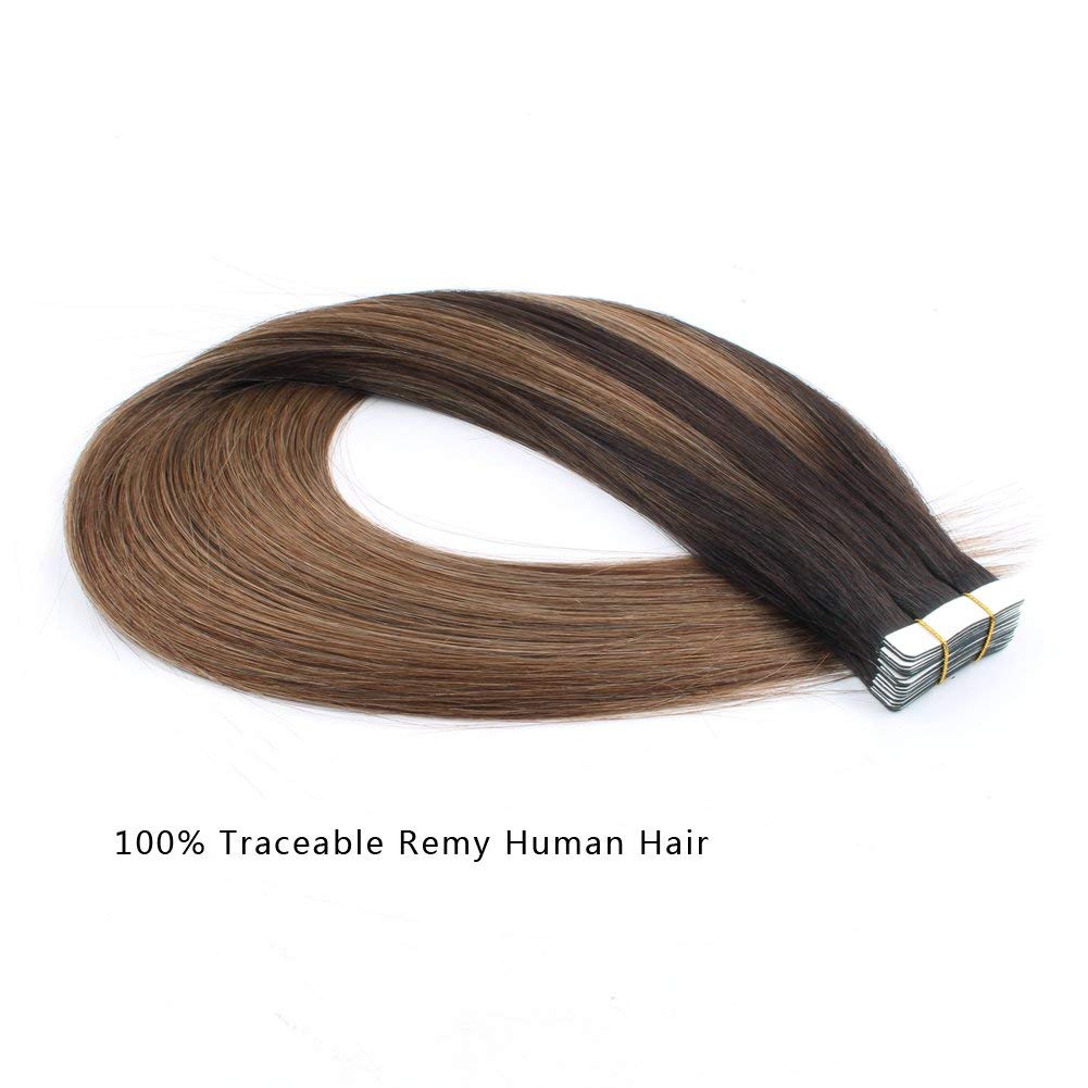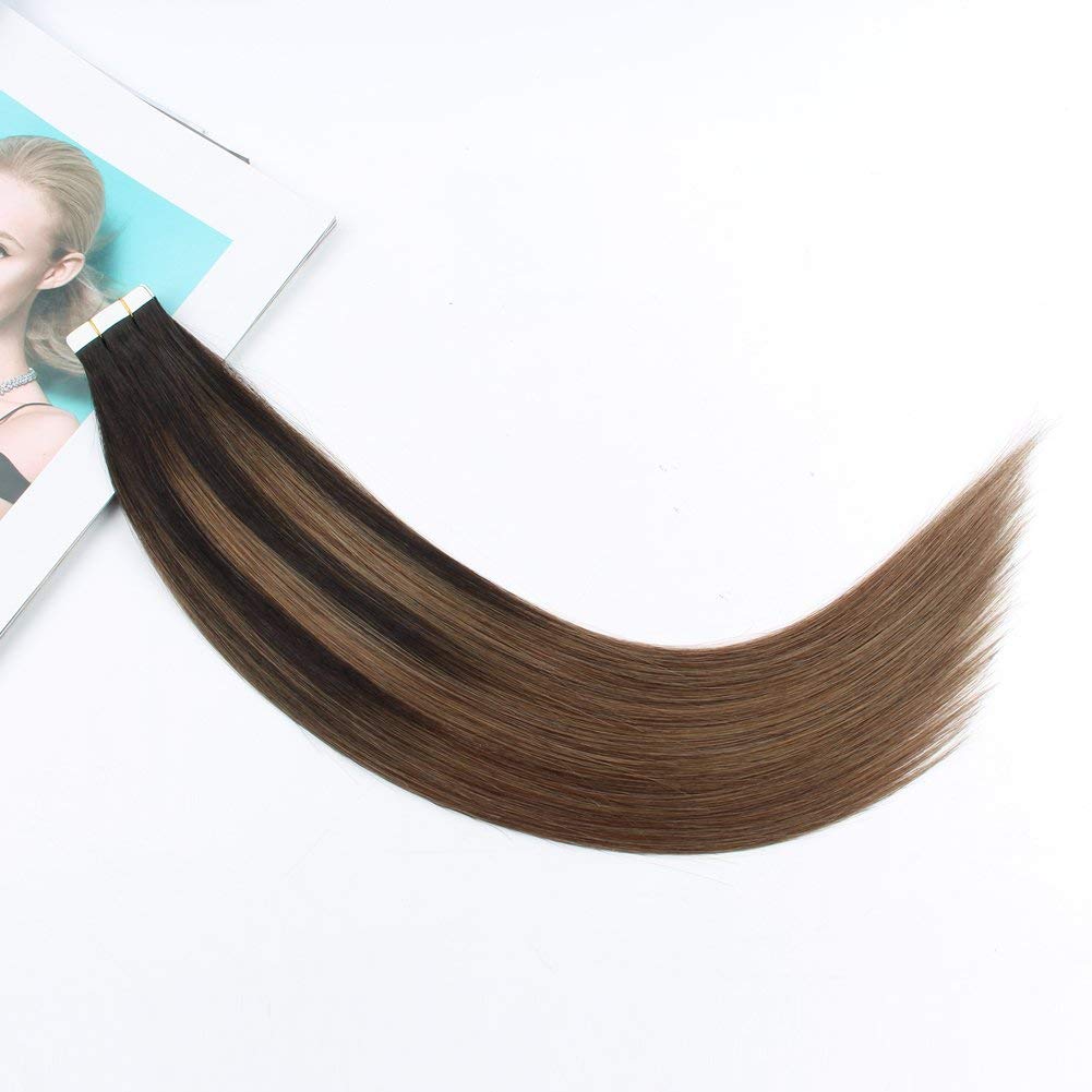 Semi-permanent Balayage Tape In Hair Extensions, Remy Human Hair, 20 Pieces 50 Grams, Balayage Dark Brown Fading Into Chestnut Brown B2-6, 14 Inch