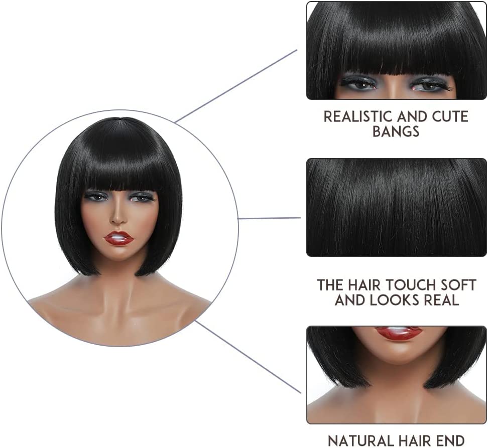 Wigs with bangs: short wigs with bangs for young girl and woman. Straight texture Yaki weak, natural and super soft, easy to manage.