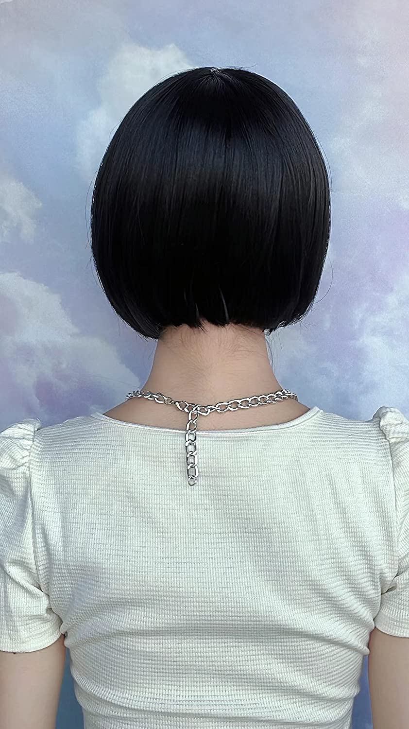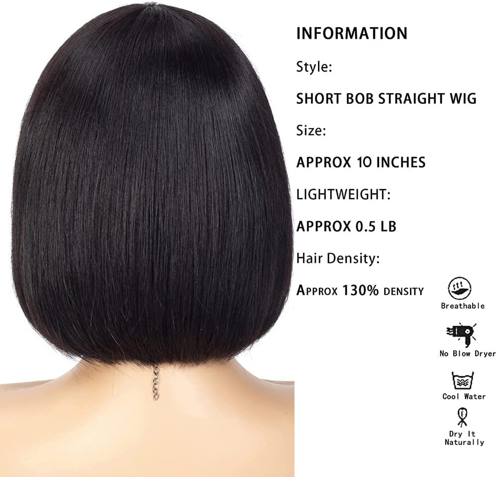 Short black women wig with bangs 10 inches bob shoulder length resistant to heat synthetic hair straight lace wig not before (1b)