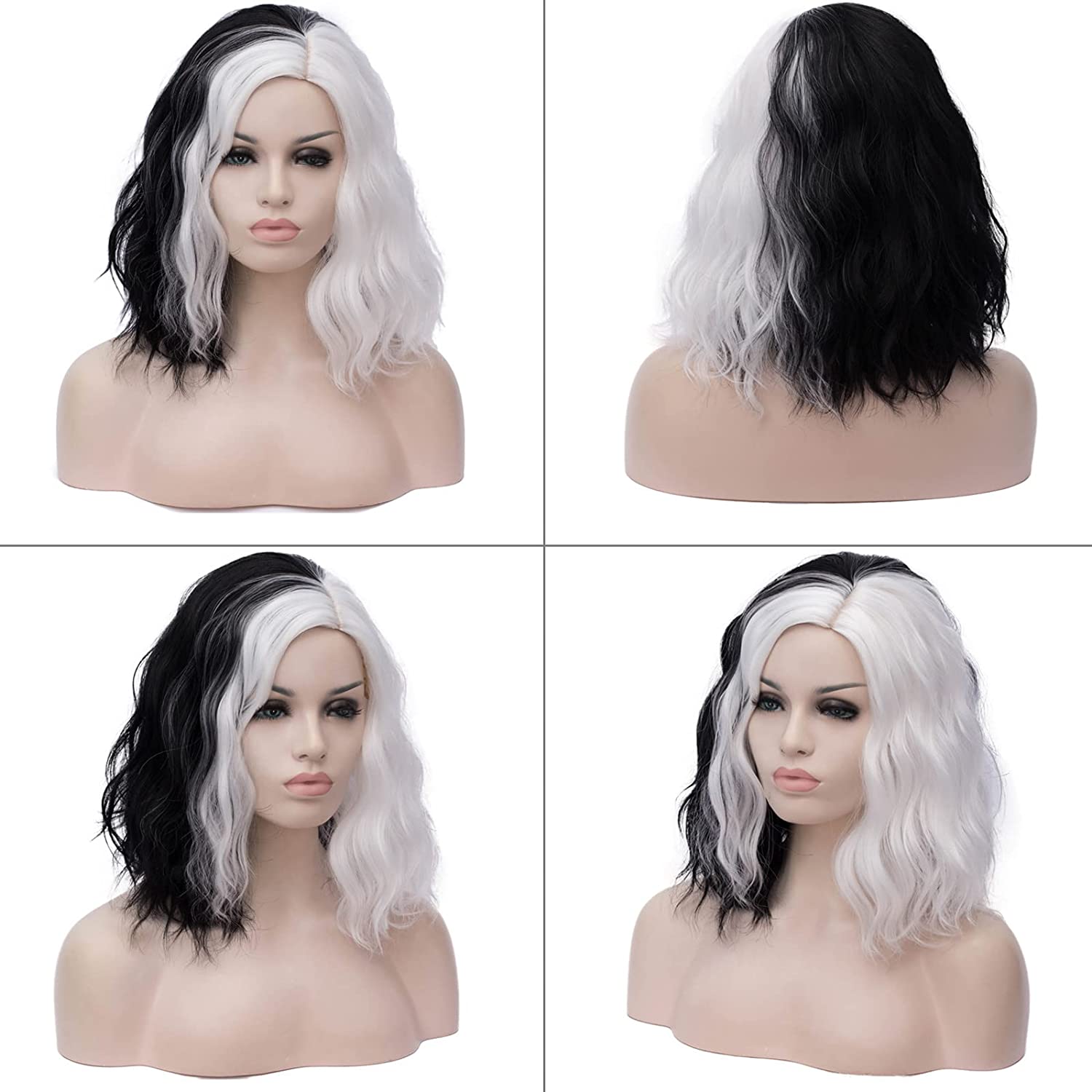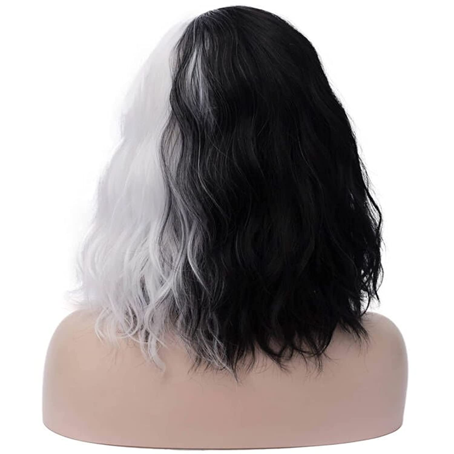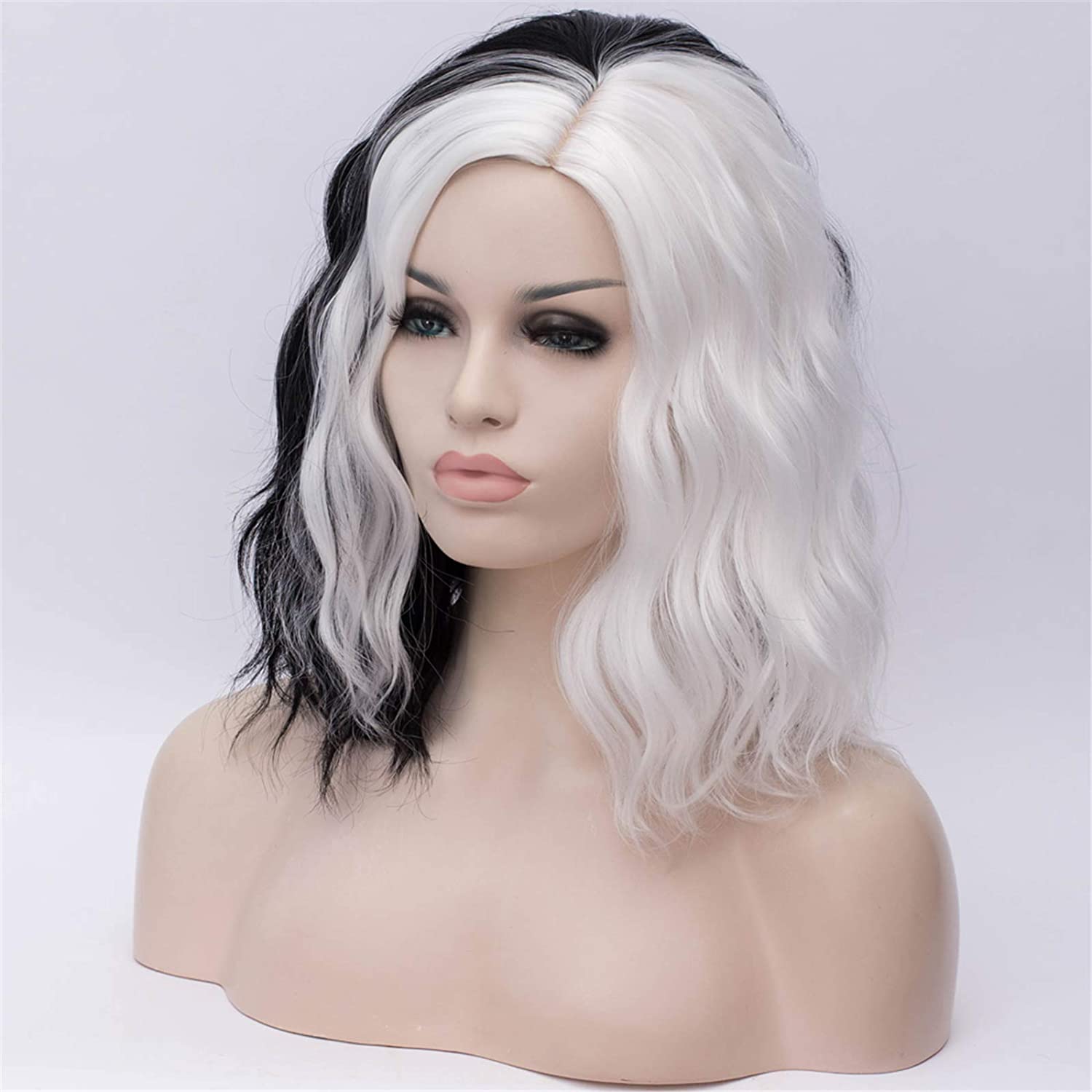 Short Bob Wavy Curly Wig Lady Costume Black and White Wig For Women Cosplay Halloween Wigs Heat Resistant Bob Party Wig Include Wig Cap (Black and White)