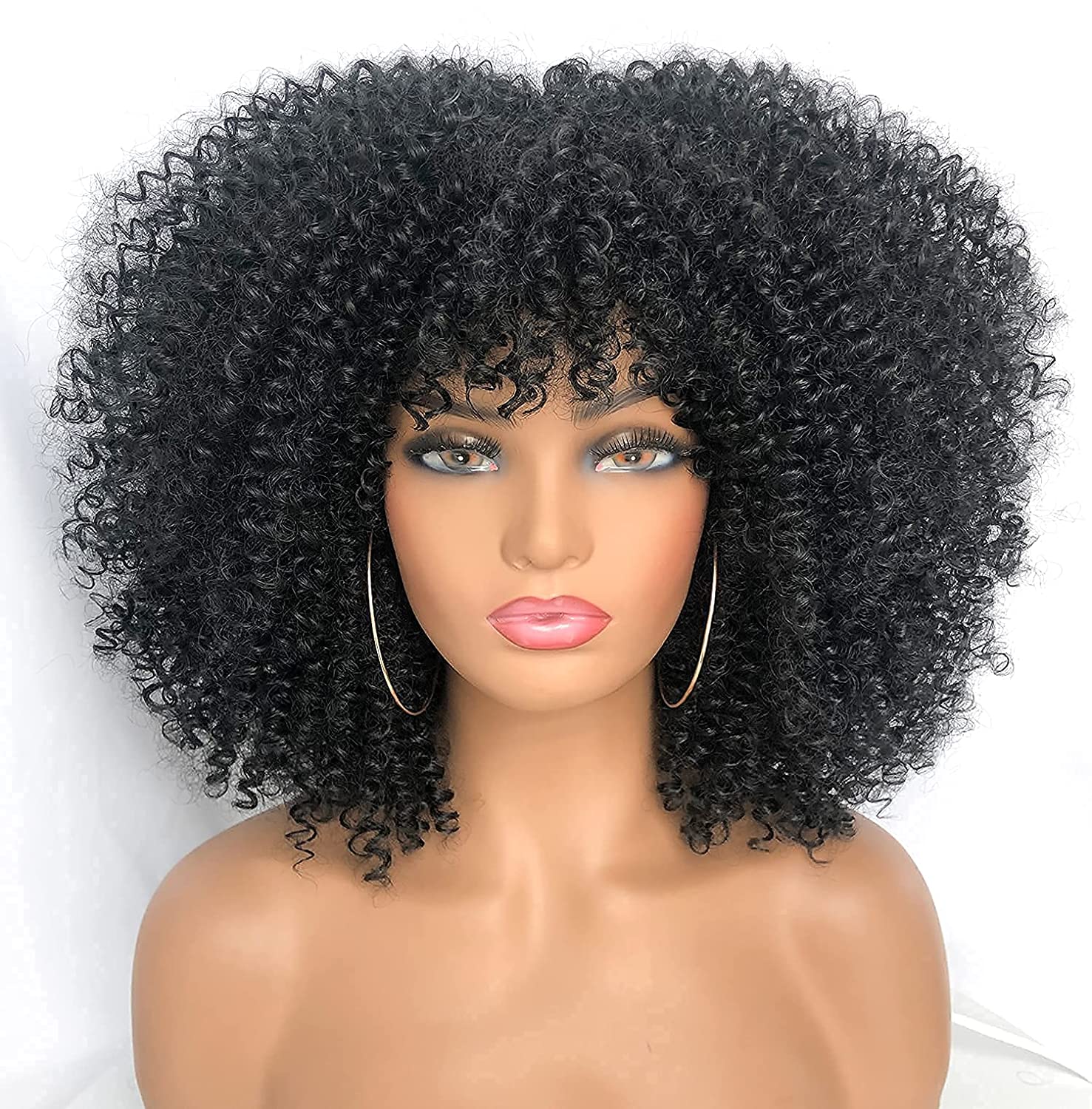 Short Curly Afro Wig With Bangs for Black Women Kinky Curly Hair Wig Afro Synthetic Full Wigs(Black)