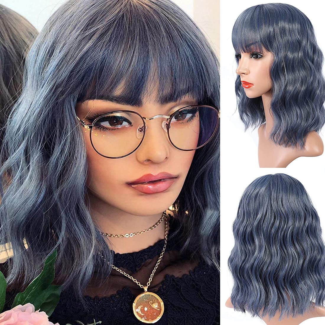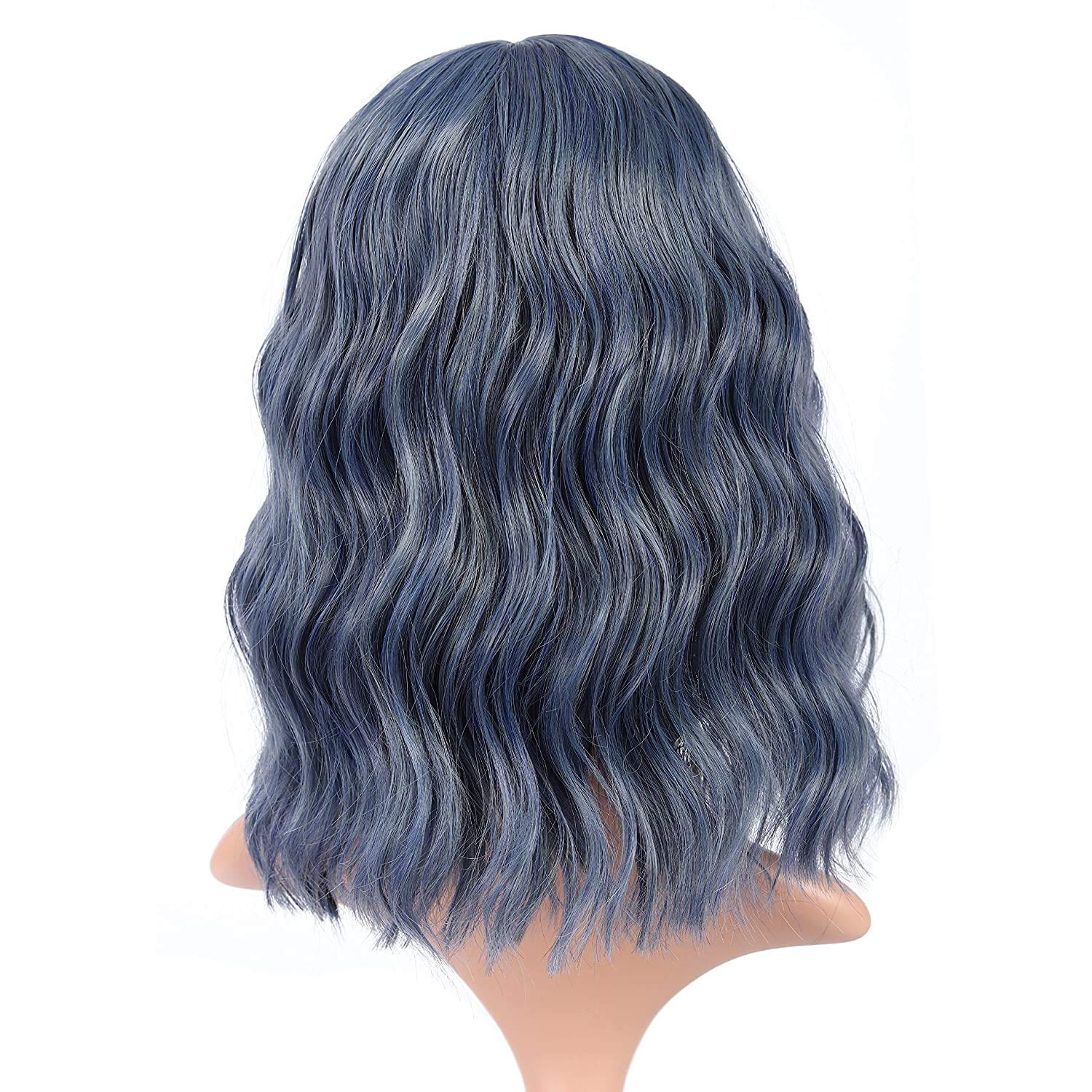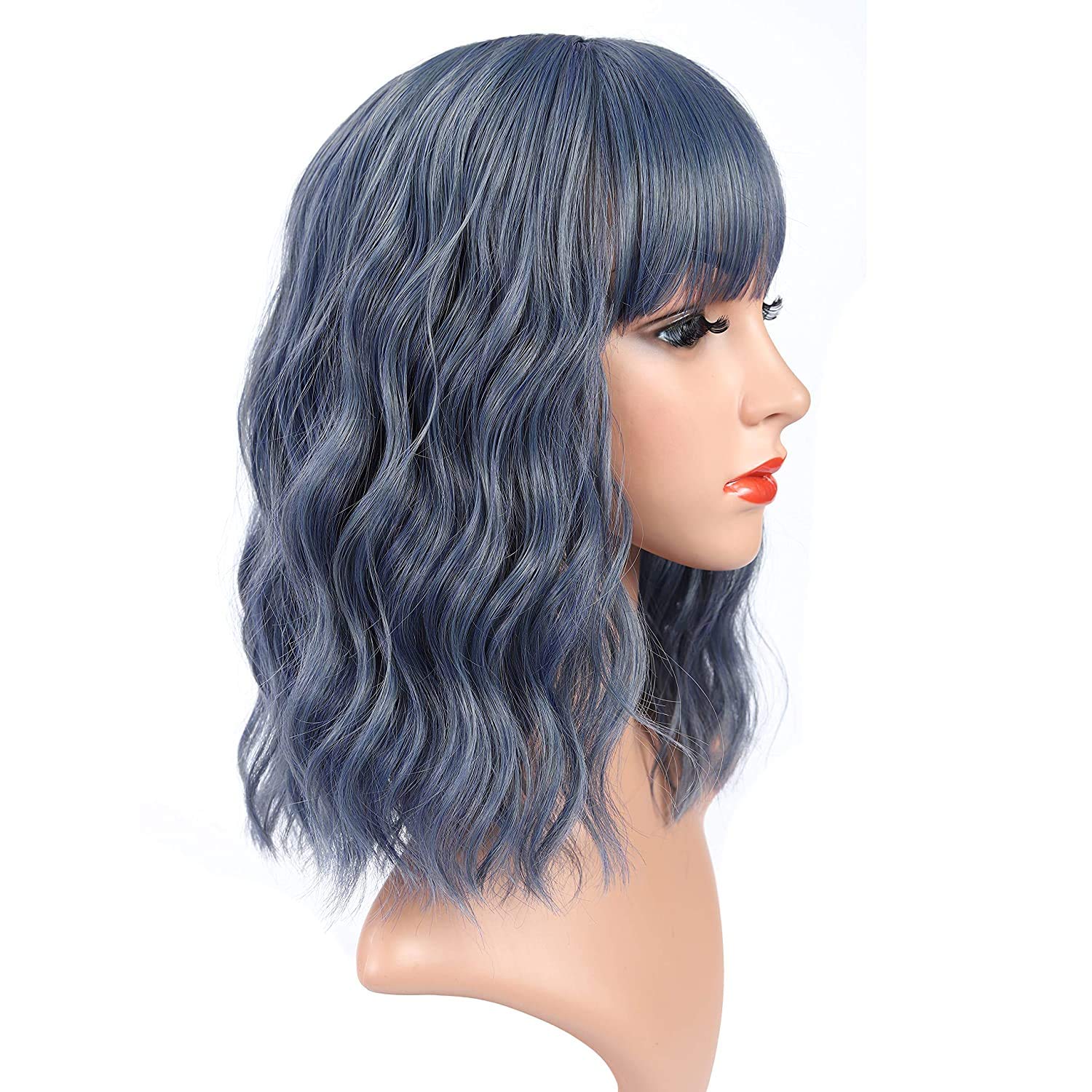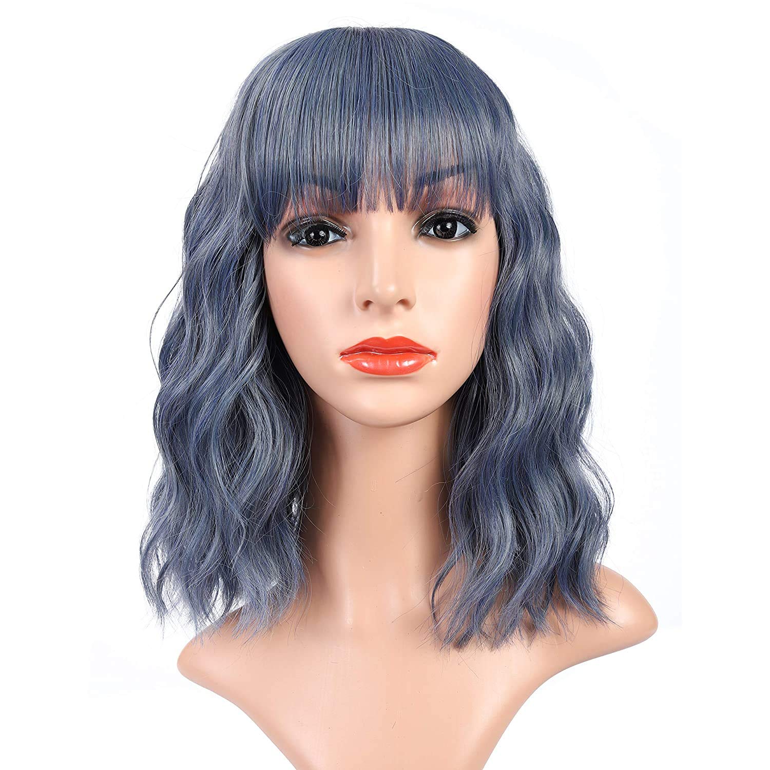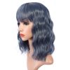 Shoulder Length Short Curly Full Bang Women Wavy Bob Wig (blue)