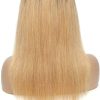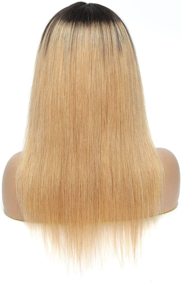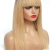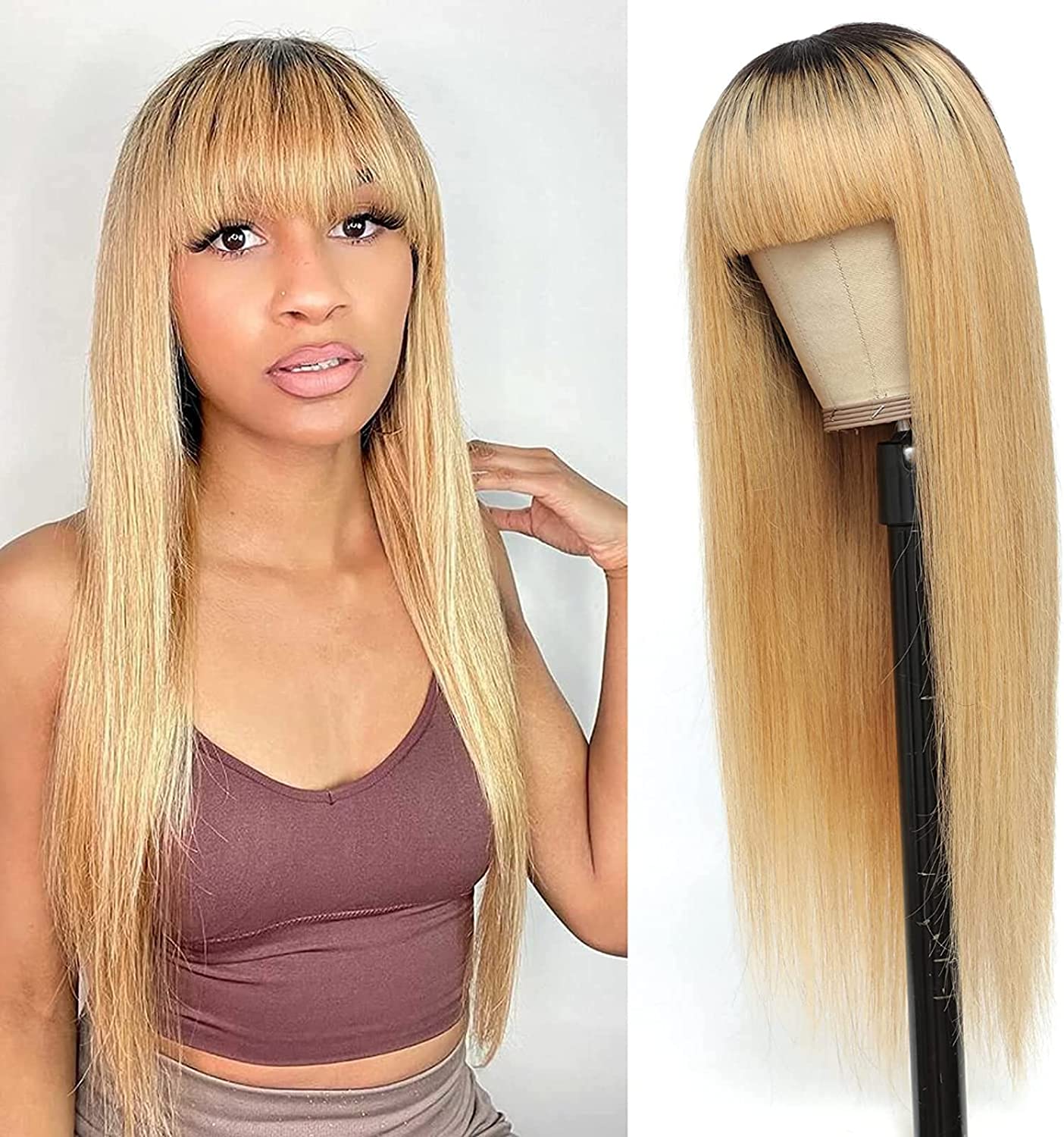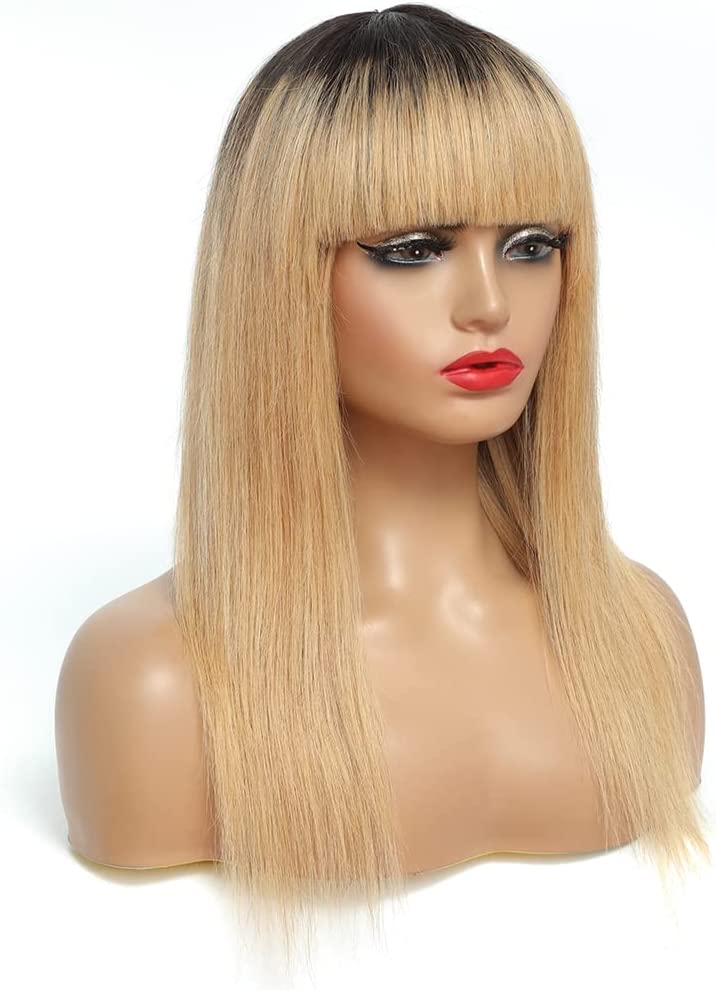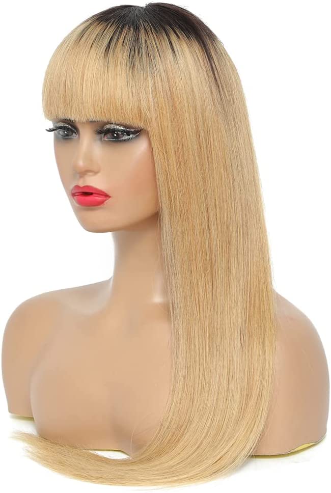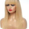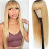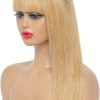 Straight Human Hair Wig With Bangs 16inches Short Bob Wig Ombre Blond Brazilian Remy Human Hair Wig Natural Looking Free Part 150% Density Wig Without Lace Wig For Beginner Friendly Wig(16″)